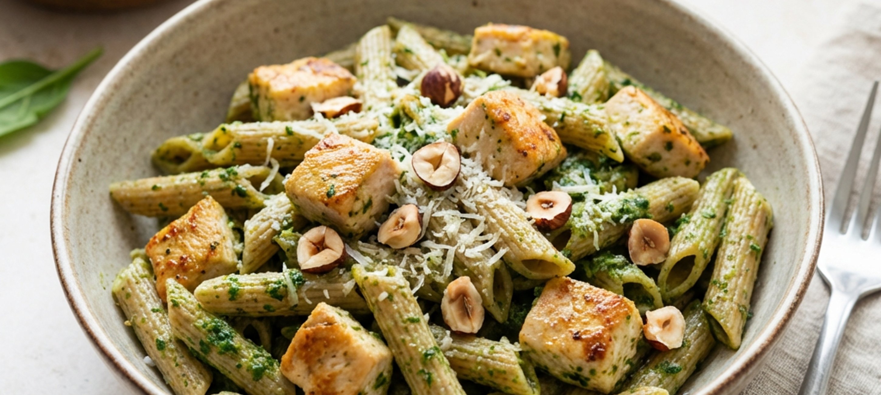 - 4Uvařené těstoviny sceďte a přimíchejte k nim špenátové pesto společně s orestovaným kuřetem. Rozdělte na 4 porce a podávejte.