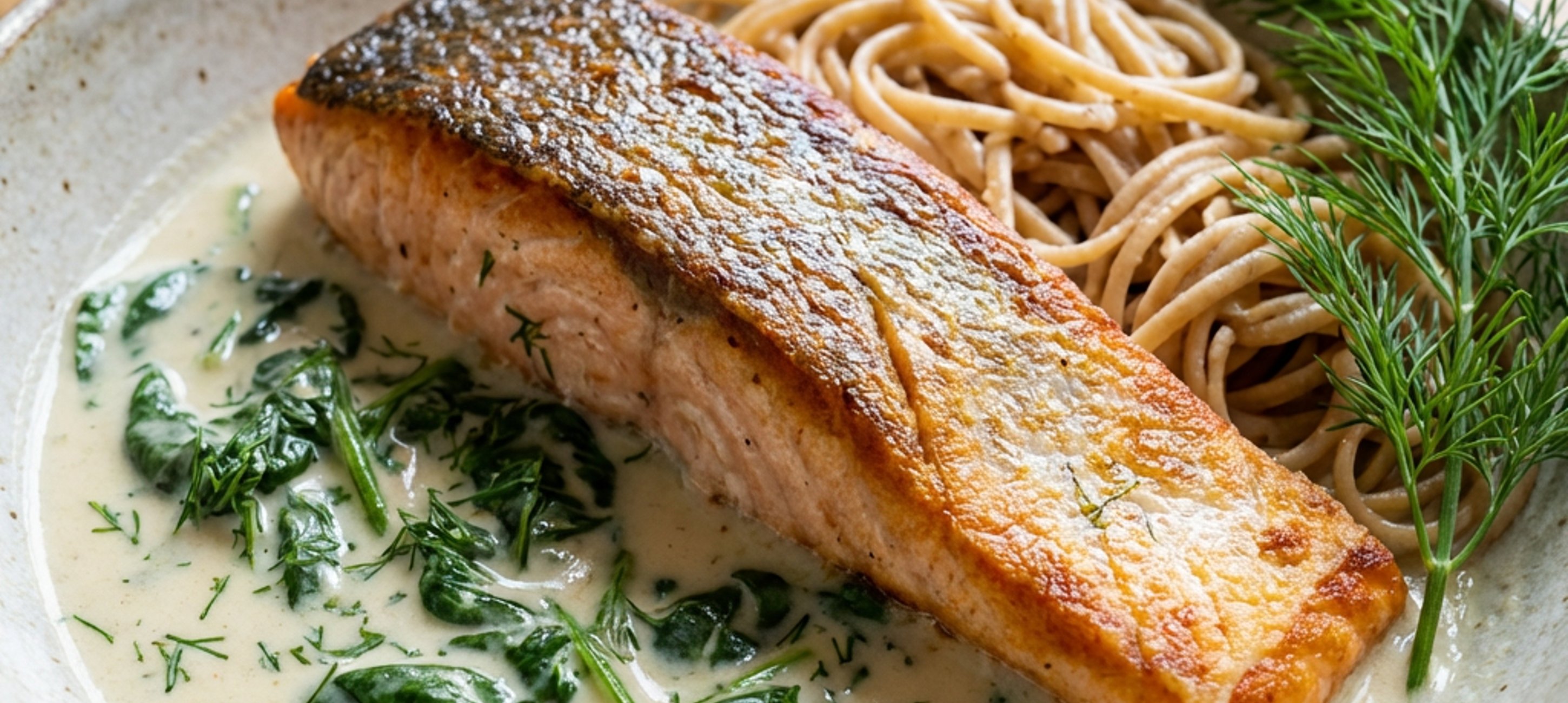- 4Filety vyjměte z pánve a přemístěte je do zapékací mísy (20 cm × 30 cm). Pánev nechte na plotýnce, rozehřejte v ní 1 lžíci olivového oleje, přidejte nasekanou cibuli a smažte ji zhruba 1 minutu na středním plameni. Poté snižte plamen, přidejte do pánve utřený česnek, zamíchejte a hned nato přidejte špenát. Vše opékejte 4 minuty na mírném plameni. Nakonec obsah pánve zalijte kokosovým mlékem, dochuťte solí a pepřem a nechte 3 minuty společně provařit. Vzniklou směs nalijte do zapékací mísy k lososím filetům, mísu dejte do předehřáté trouby a pečte 7–8 minut při 170–180 °C.