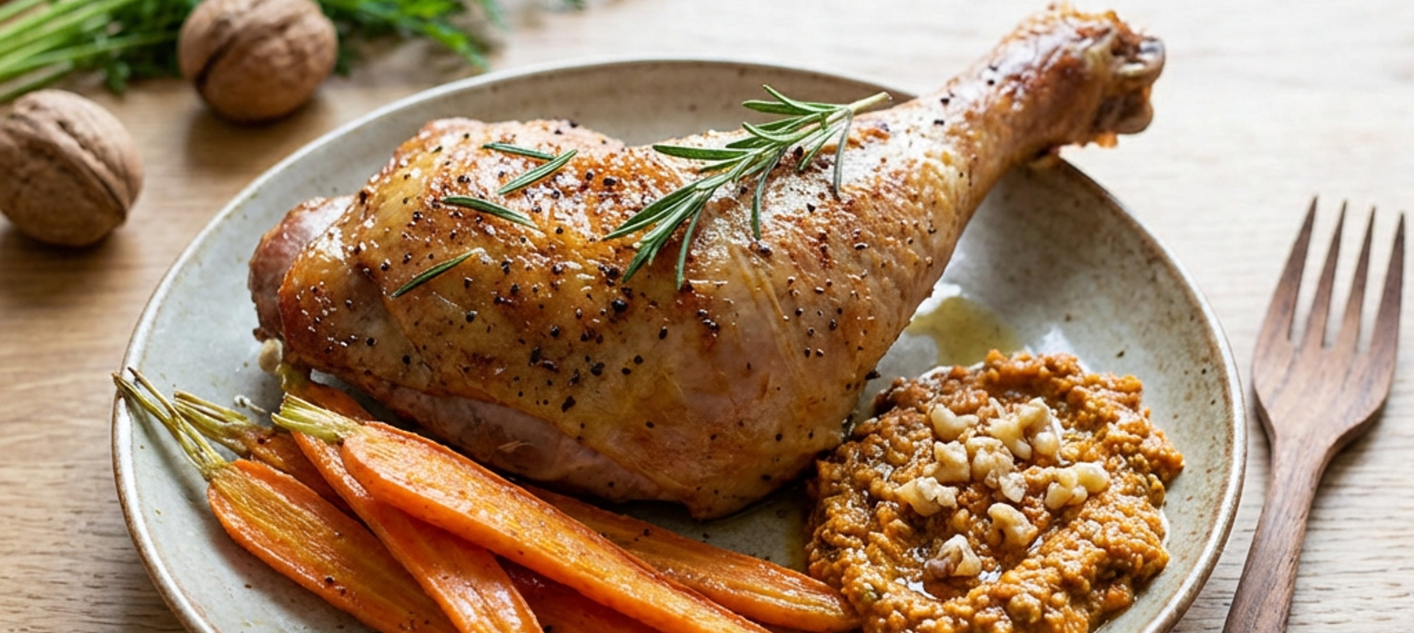 - 1Troubu předehřejte 150 °C. Krůtu ze všech stran osolte, opepřete a vložte ji do zapékací mísy. Přidejte rozmarýn a 2 stroužky česneku nakrájené na plátky. Pomocí mašlovačky maso potřete 1 lžící slunečnicového oleje. Zapékací mísu přiklopte pokličkou a dejte do předehřáté trouby. Krůtu pečte 55–65 minut (záleží na tloušťce stehen) při 150–160 °C.