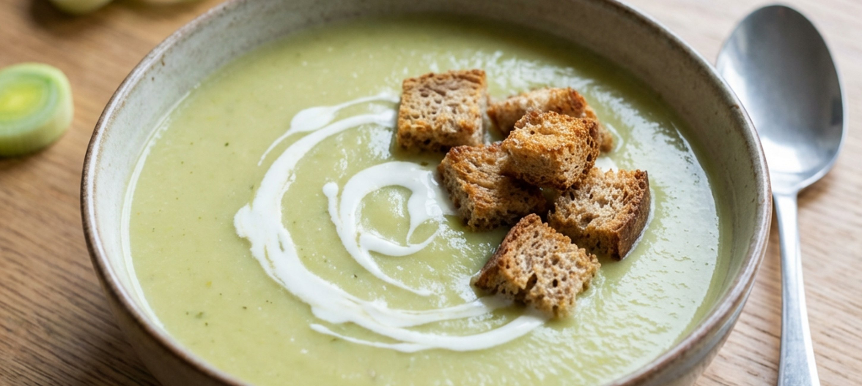 - 4Uvařenou polévku odstavte z plotýnky, rozmixujte ji ponorným mixérem dohladka a přilijte do ní smetanu. Nakonec polévku osolte a opepřete, rozdělte do 4 talířů, každou porci posypte připravenými krutony a podávejte.
