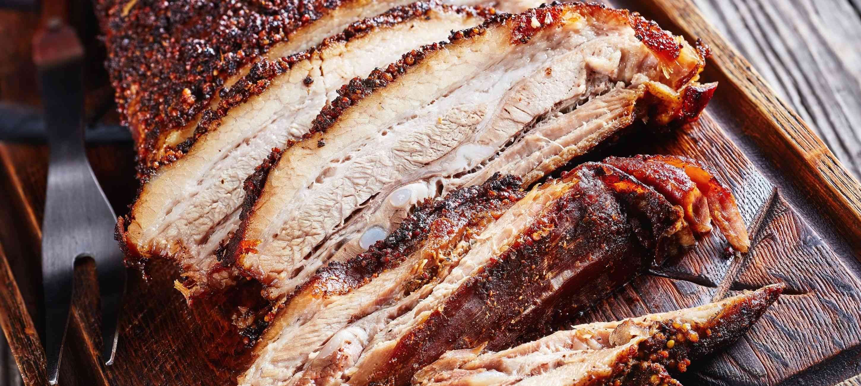 - 2Score the skin of the pork belly across with a sharp knife and salt it. Then season the meat side with salt, black pepper (coarsely ground), caraway seeds, sugar, crushed garlic, and diced onion.