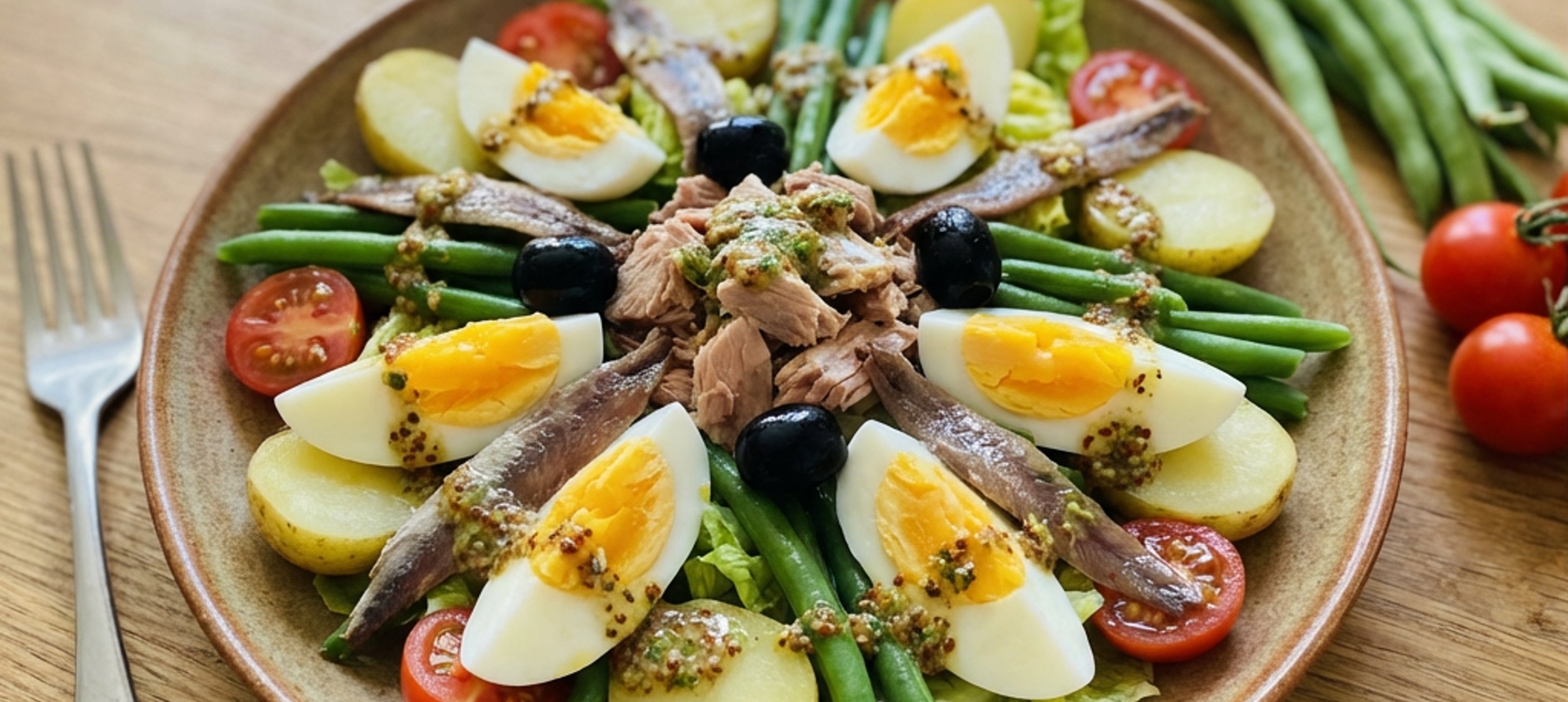 - 4Na dno mísy nebo servírovacího talíře poklademe salát, na něj dáme brambory překrojené na půlky nebo čtvrtky, zelené fazolky, rajčata, olivy, vejce překrojená podélně na čtvrtky, nahoru nadrobíme tuňáka a položíme celé plátky ančoviček.