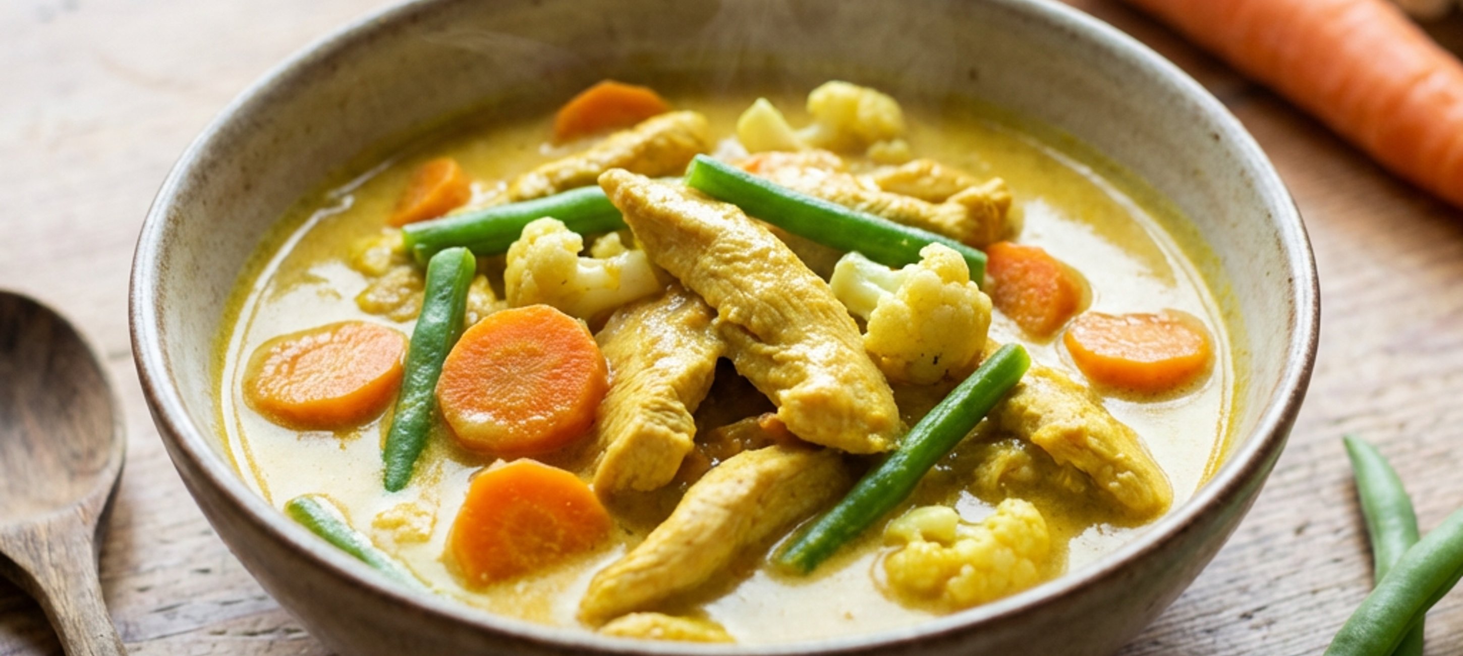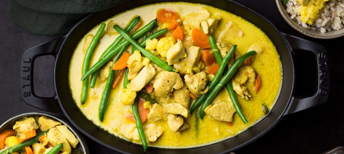 - 4Na závěr přemístěte opečená kuřecí prsa do pánve se zeleninovou směsí, vše zalijte kokosovým mlékem, přidejte fazolové lusky a obsah pánve nechte 5–10 minut prohřát na středním plameni. Hotovou kuřecí směs rozdělte na 4 porce, podle libosti dochuťte solí a pepřem a podávejte.