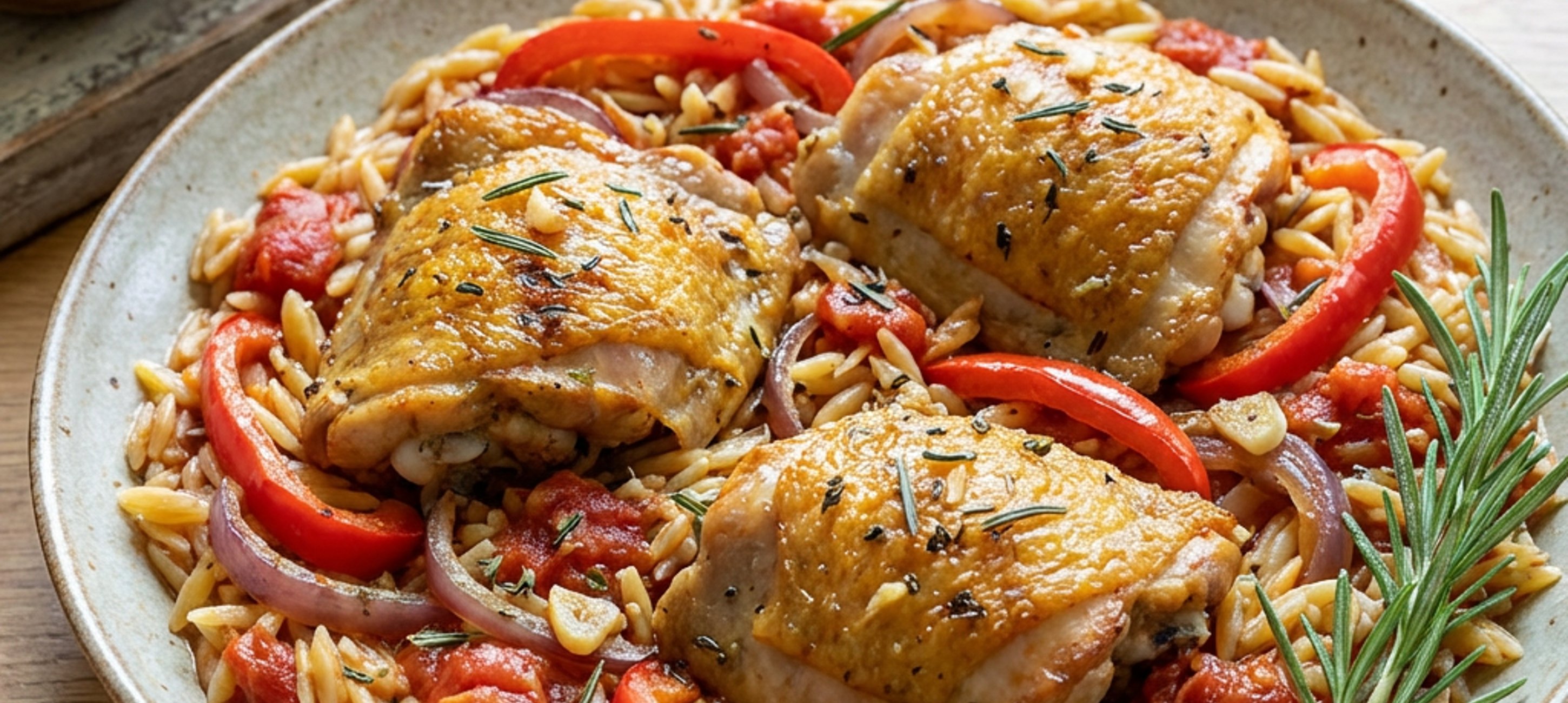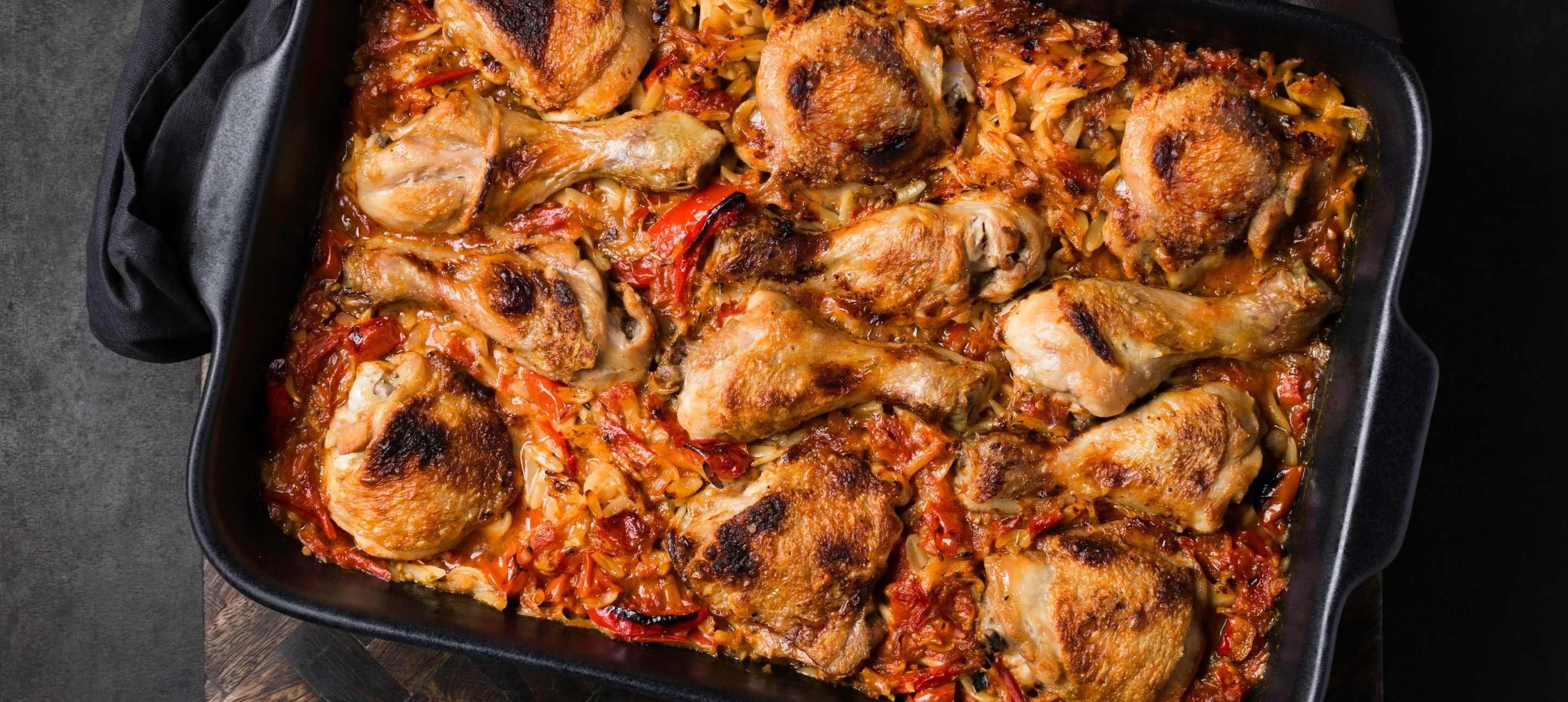 - 5Po 10 minutách směs v pánvi osolte a opepřete, přimíchejte do ní těstovinovou rýži a pánev odstavte. Směs přemístěte do pekáče nebo zapékací mísy, navrch naskládejte opečená kuřecí stehna, vložte do předehřáté trouby a pečte 20 minut při 180 °C. Po uvedené době zvyšte teplotu na 220 °C a pečte ještě 10 minut.