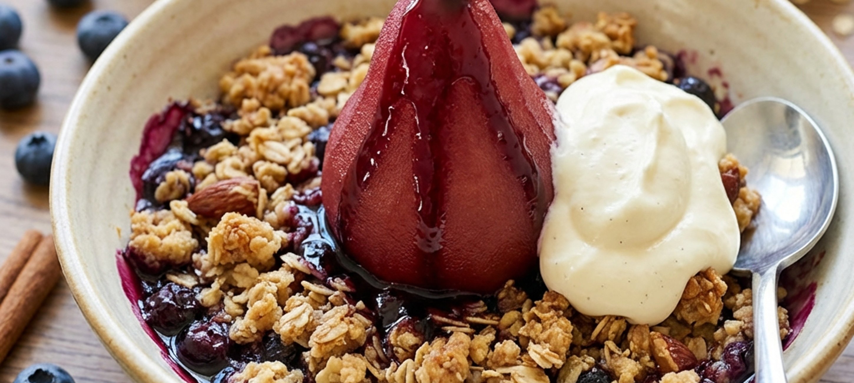 - 3Krambl nabírejte přímo z formy lžící do misky nebo na talířek. Na něj lžící dejte kopeček krému, pošírovanou hrušku a zakapejte sirupem.