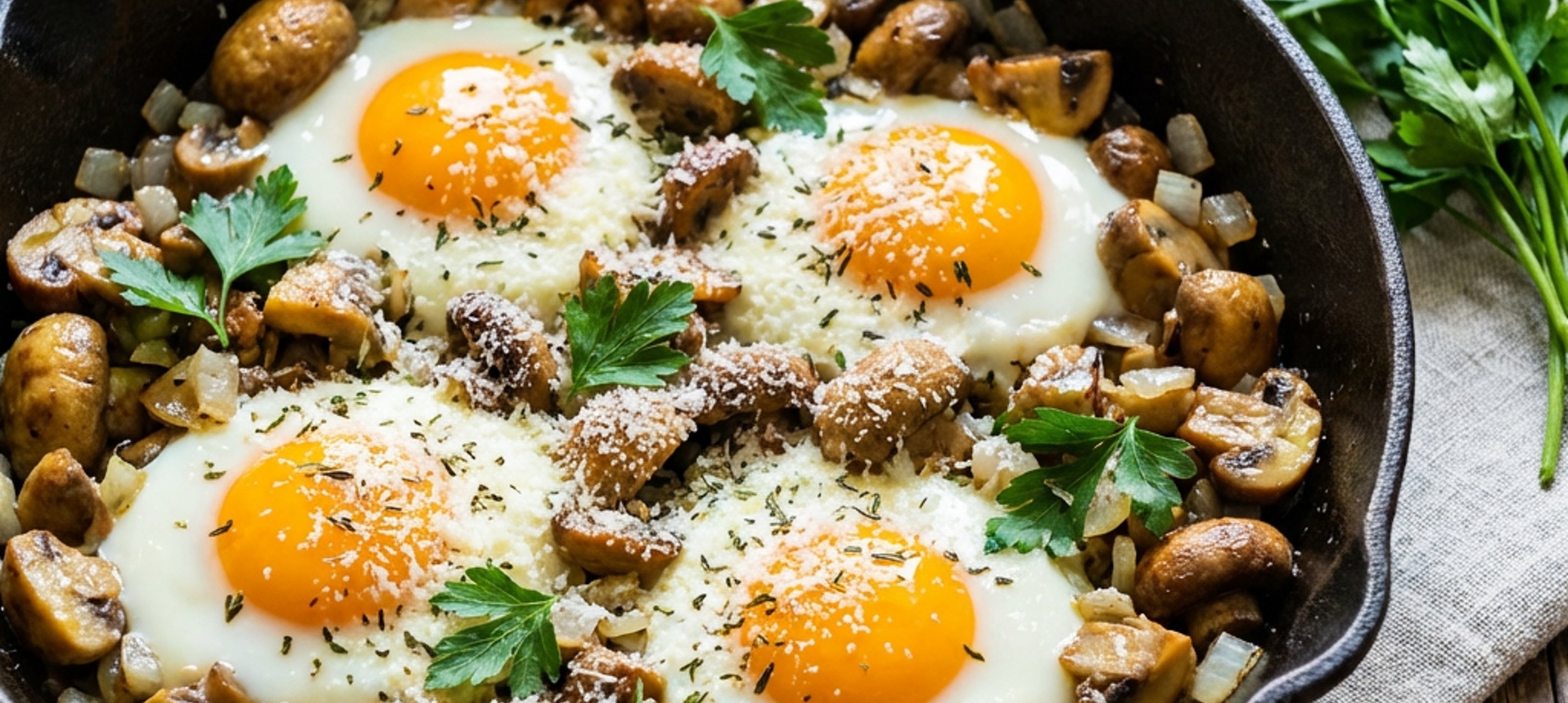 - 3Následně do pánve vyklepněte vejce a vše posypte parmazánem. Celou pánev vložte do vyhřáté trouby a pečte 4–5 minut na 185–190 °C. Poté podávejte.