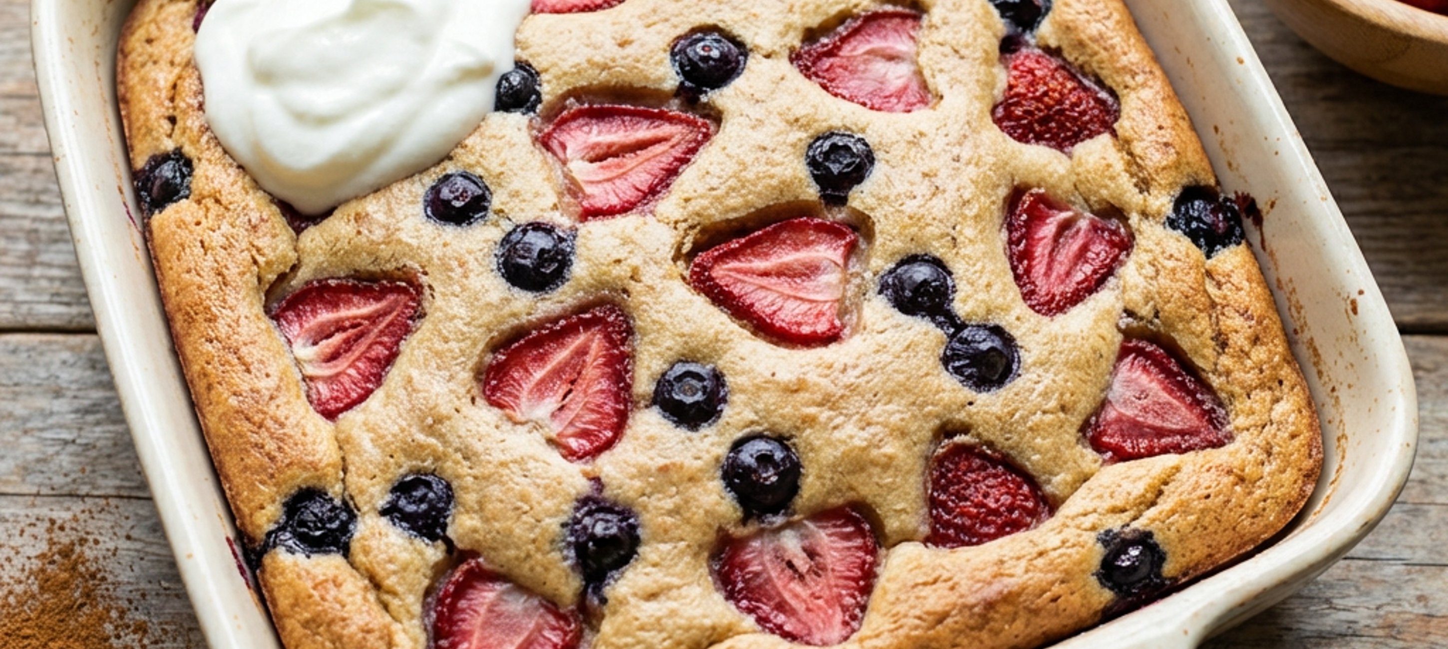 - 2Do středně velké mísy dejte mouku, kypřicí prášek a skořici a promíchejte. Poté přidejte med, mléko, vejce a olej a metličkou vymíchejte v hladké těsto. Hotové těsto nalijte do připravené pečicí formy a navrch naneste jahody a borůvky.