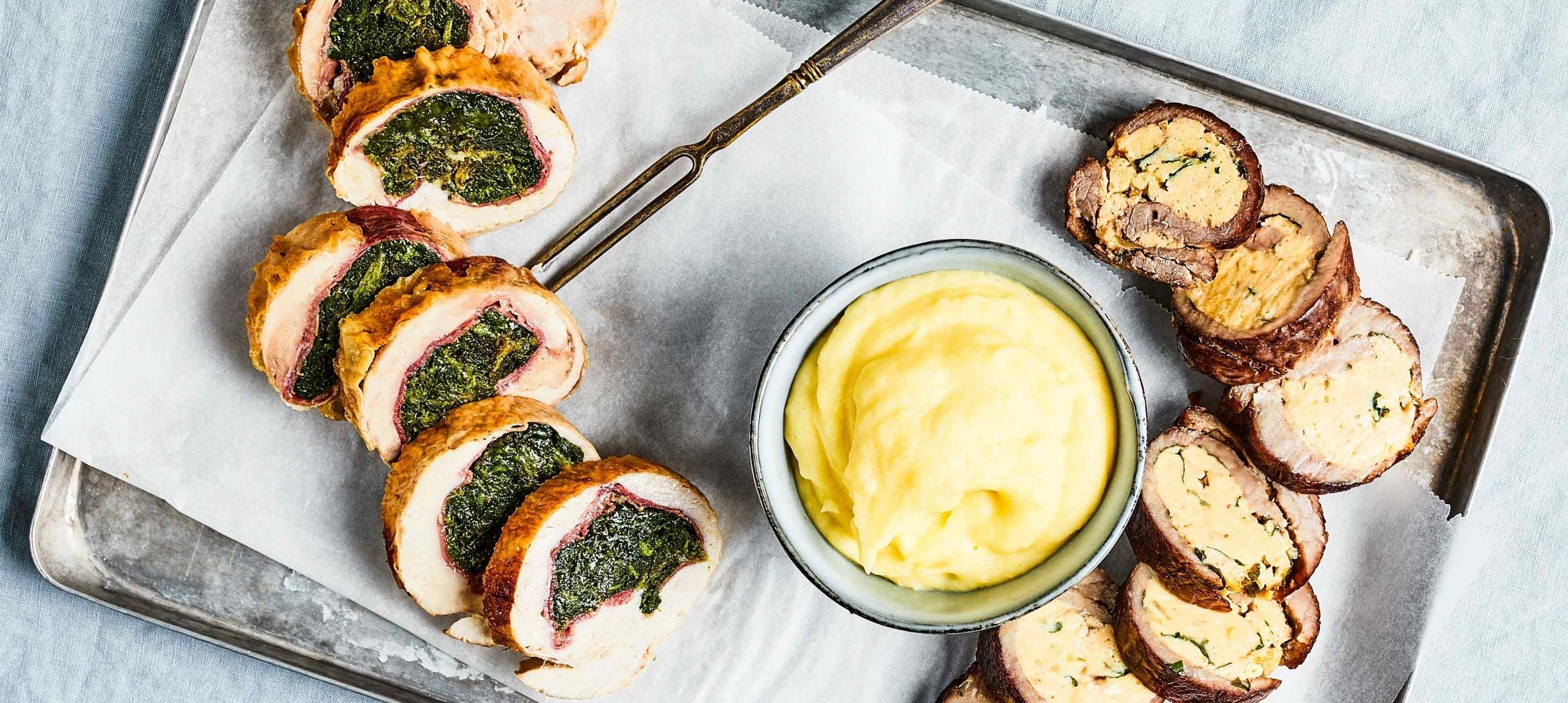 - 4Poté celý plát masa srolujte zleva doprava, vzniklou roládu zatočte do alobalu a jeho volné okraje pevně utáhněte a zahněte. Roládu dejte do zapékací nádoby, podlijte vývarem a pečte 60–65 minut při 185–190 °C.