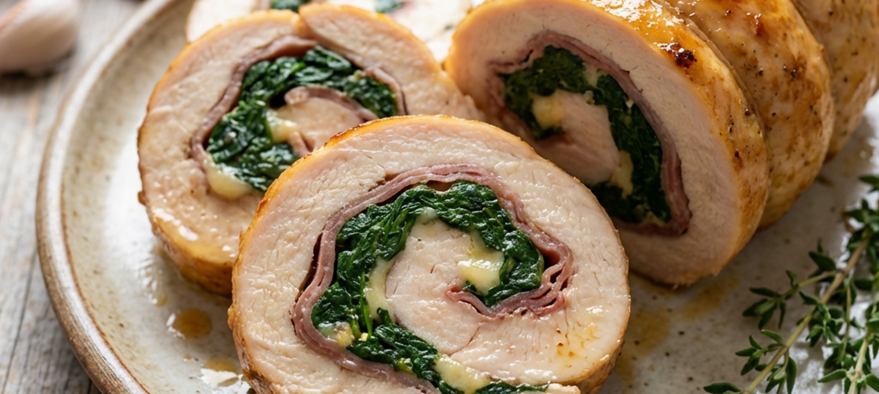 - 3Nyní si začněte připravovat roládu. Nachystejte si 2 pláty alobalu (každý o rozměrech 60–70 cm × 29 cm) a položte je na pracovní plochu kratšími stranami směrem k vám tak, aby se 10 cm vzájemně překrývaly – vznikne tedy 1 plát o rozměrech 60–70 cm × 48 cm s kratší stranou směrem k vám. Do jeho střední části vodorovně rozprostřete kuřecí prsa do souvislé vrstvy (15–20 cm od spodního i horního okraje alobalu ponechte volných) a maso osolte a opepřete. Na ½ masa rozprostřete špenát z pánvičky, na něj vodorovně naskládejte sušenou šunku a vše posypte parmazánem.