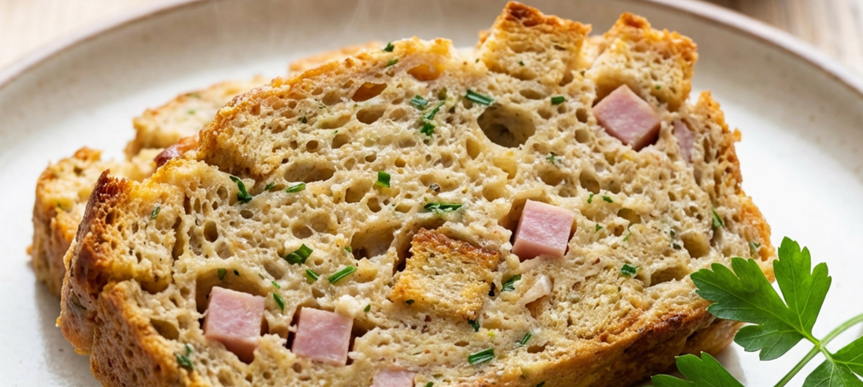 - 3Mezitím nakrájejte toastový chléb na kostky (0,5 cm × 0,5 cm) a ty vložte do připravené mísy. Jakmile bude šunka s cibulí orestovaná, vysypte celý obsah pánve do mísy k toastovému chlebu. Následně najemno nakrájejte petrželovou nať a pažitku a obě bylinky společně s muškátovým oříškem také přidejte do mísy.