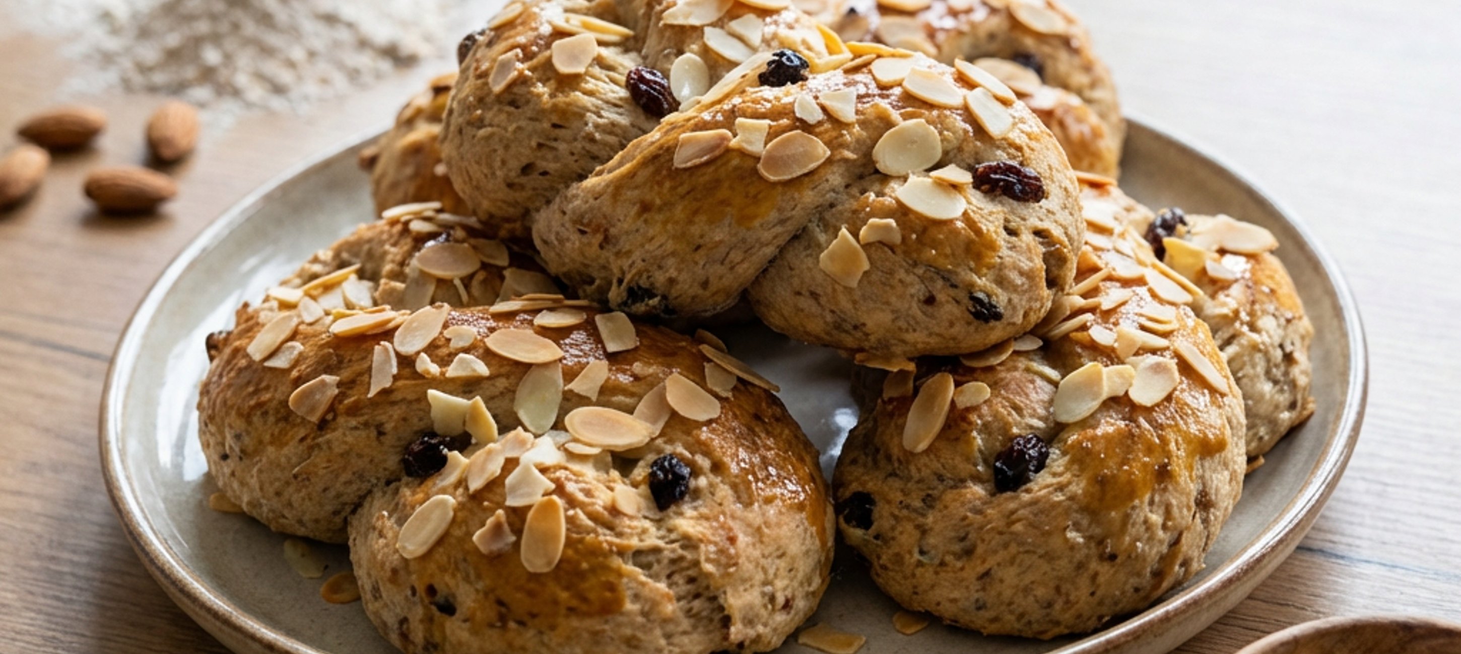 - 5V misce si rozšlehejte žloutek a jidáše jím potřete. Poté jidáše posypte mandlovými plátky a rozinkami a přemístěte je na plech vyložený pečicím papírem.