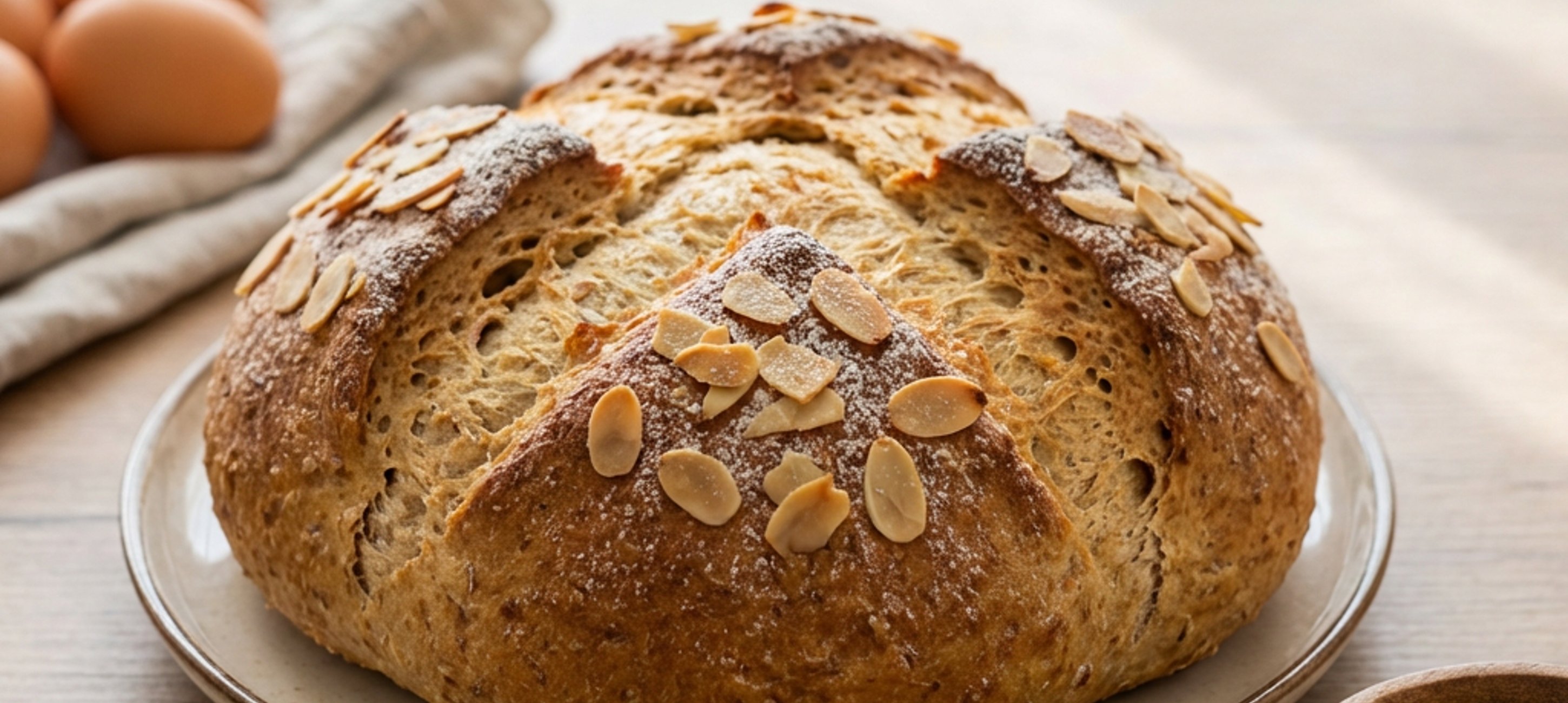 - 6Nakynuté těsto přemístěte na pracovní plochu, vytvarujte z něj bochánek a přesuňte ho na plech vyložený pečicím papírem. V menší misce rozšlehejte vejce. Bochánek posypte mandlovými plátky a pomocí mašlovačky potřete rozšlehaným vejcem.