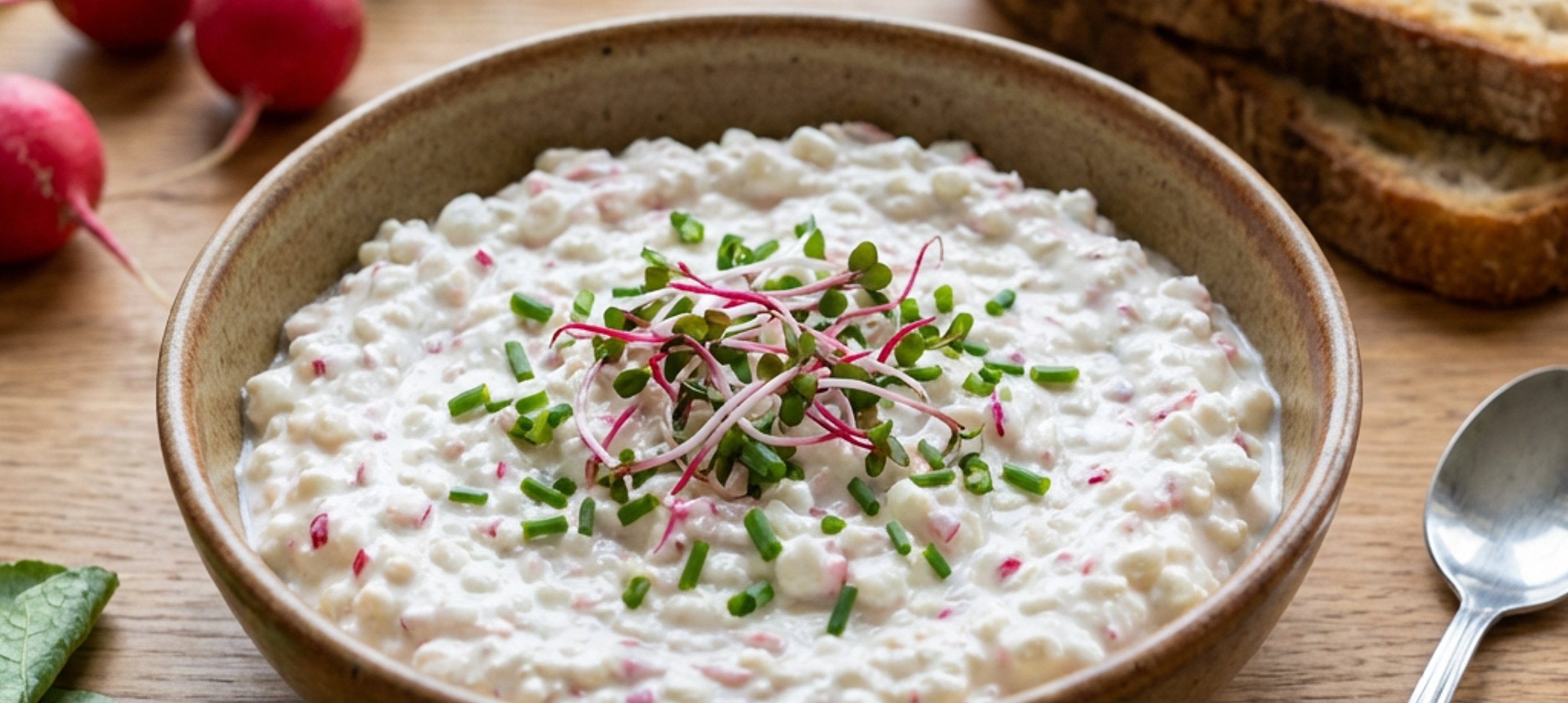 - 2Ředkvičky omyjte, nastrouhejte najemno a vložte do cedníku. K nastrouhaným ředkvičkám přidejte cottage sýr a nechte okapat přebytečné tekutiny.