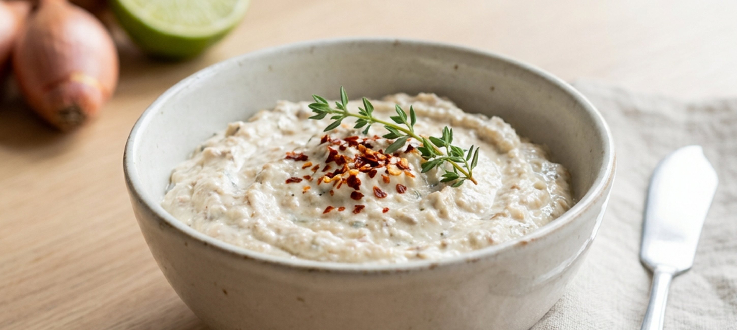 - 1Sardinky sceďte, vložte do misky a rozmačkejte vidličkou. Poté k nim přidejte najemno nakrájenou šalotku, odtučněný tvaroh, limetkovou šťávu, dijonskou hořčici, sušený tymián, prolisovaný stroužek česneku, špetku soli a pepře a vše promíchejte