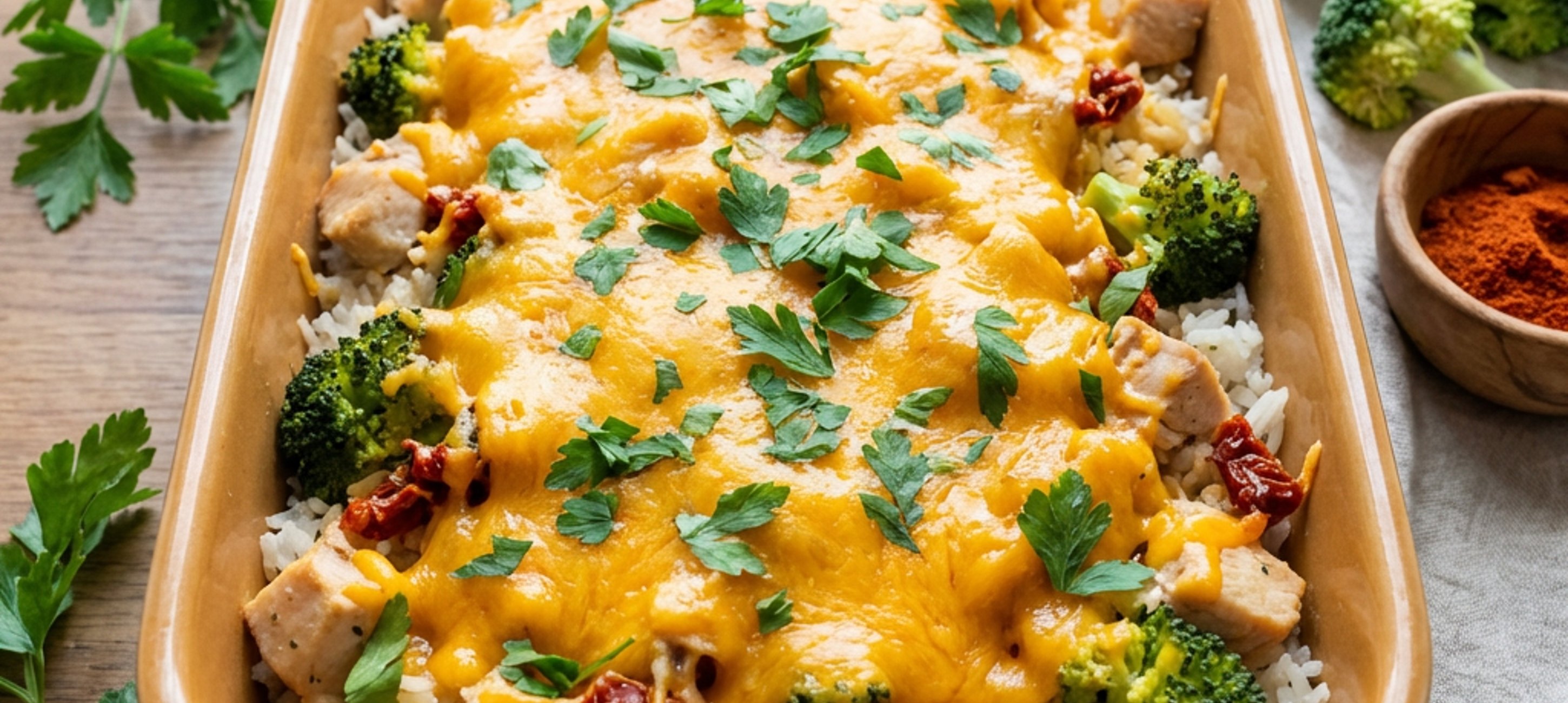 - 3Poté mísu vyndejte, přidejte rýži a sušená rajčata a smíchejte s masem. Navrch dejte vrstvu brokolice a vtlačte ji do rýže, zasypte čedarem a pečte 15–20 minut na 180 °C.