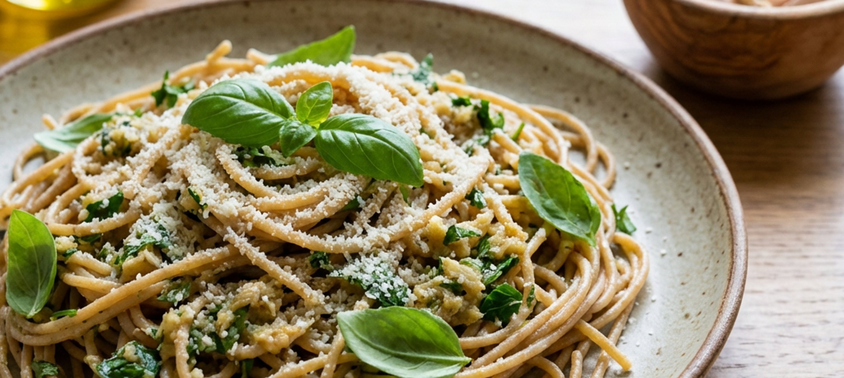 - 5Jakmile budete mít pesto připravené, vmíchejte ho do špaget a dle potřeby prohřejte na pánvi na středním plameni. Jednotlivé porce posypte strouhaným parmazánem a následně podávejte.