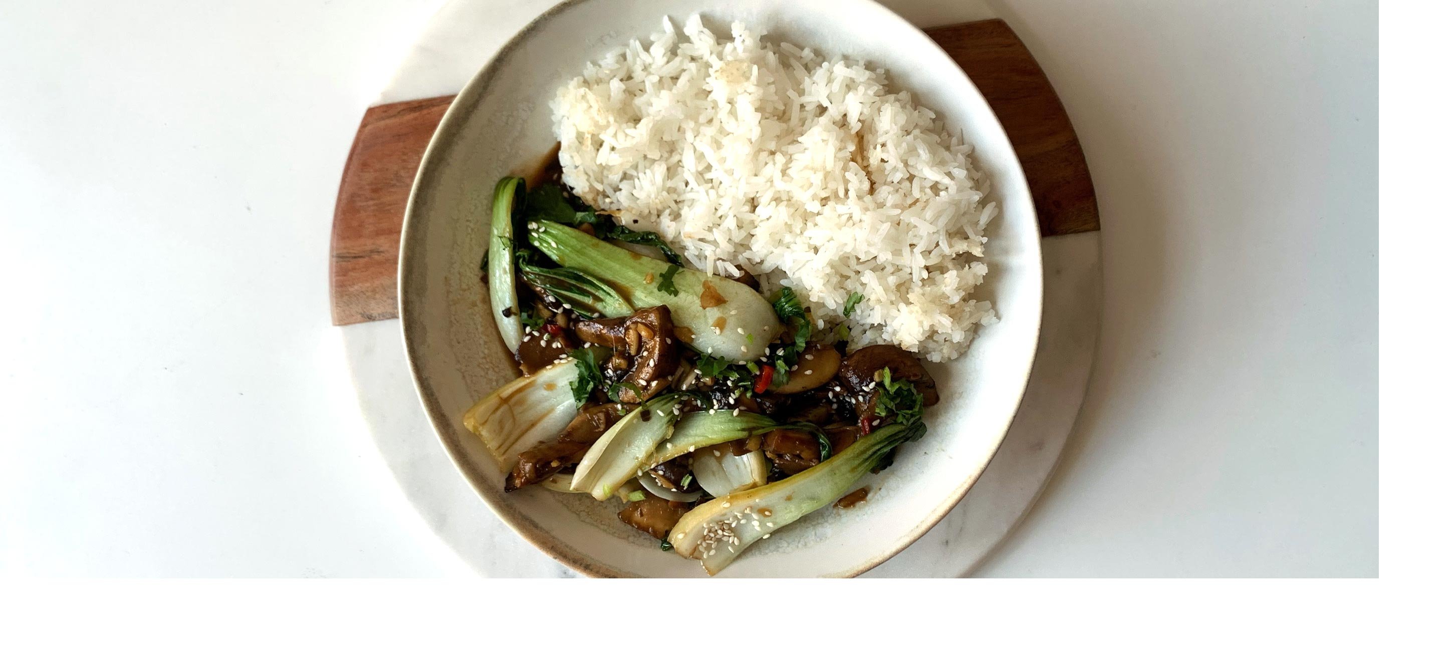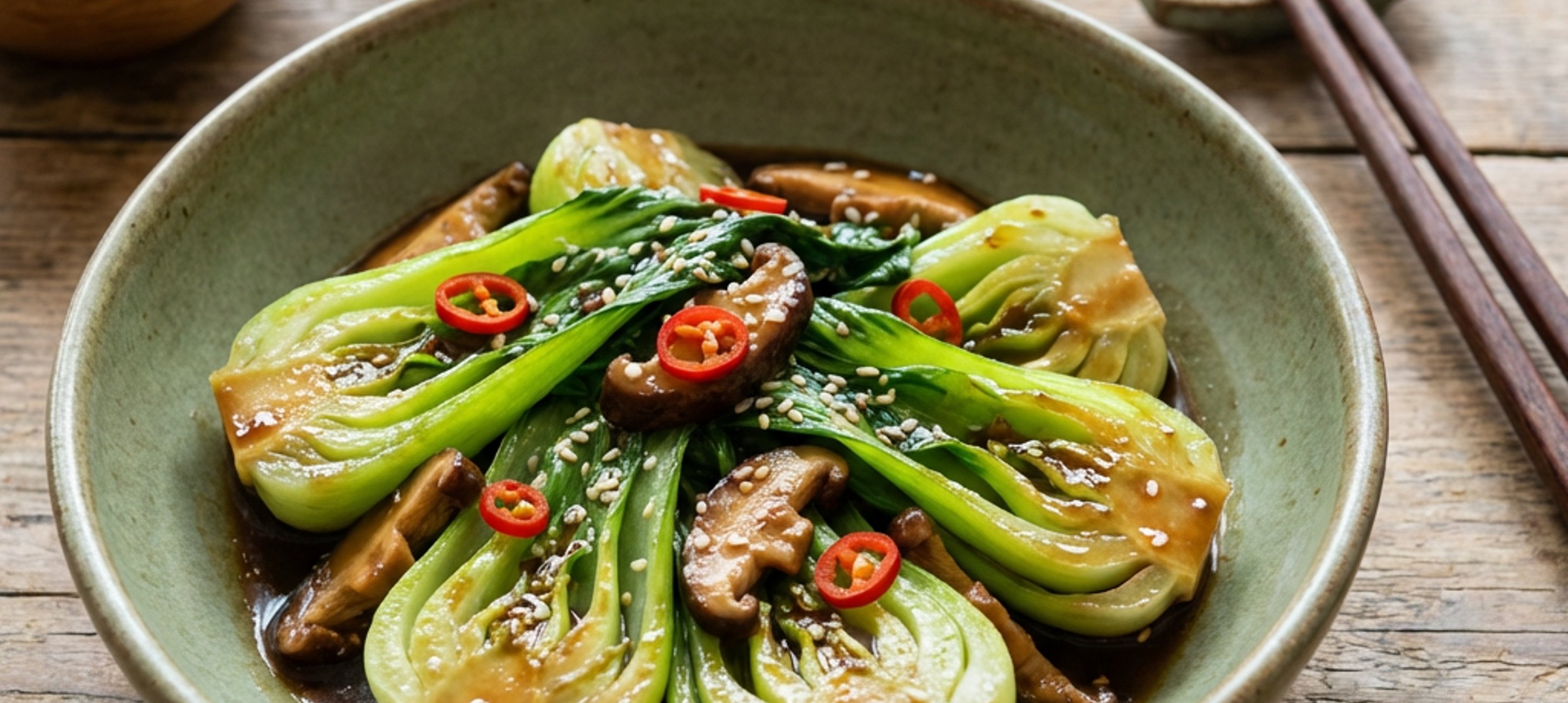 - 3Na sezamovém oleji orestujeme česnek, zázvor a chilli. Přidáme shiitake houby, cca 3 minuty restujeme a pak přidáme nakrájený pak choi. Přidáme hoisin a dochutíme rybí omáčkou. Přilijeme 5 polévkových lžic vody (můžeme i vývar) a redukujeme 2 - 3 minuty.