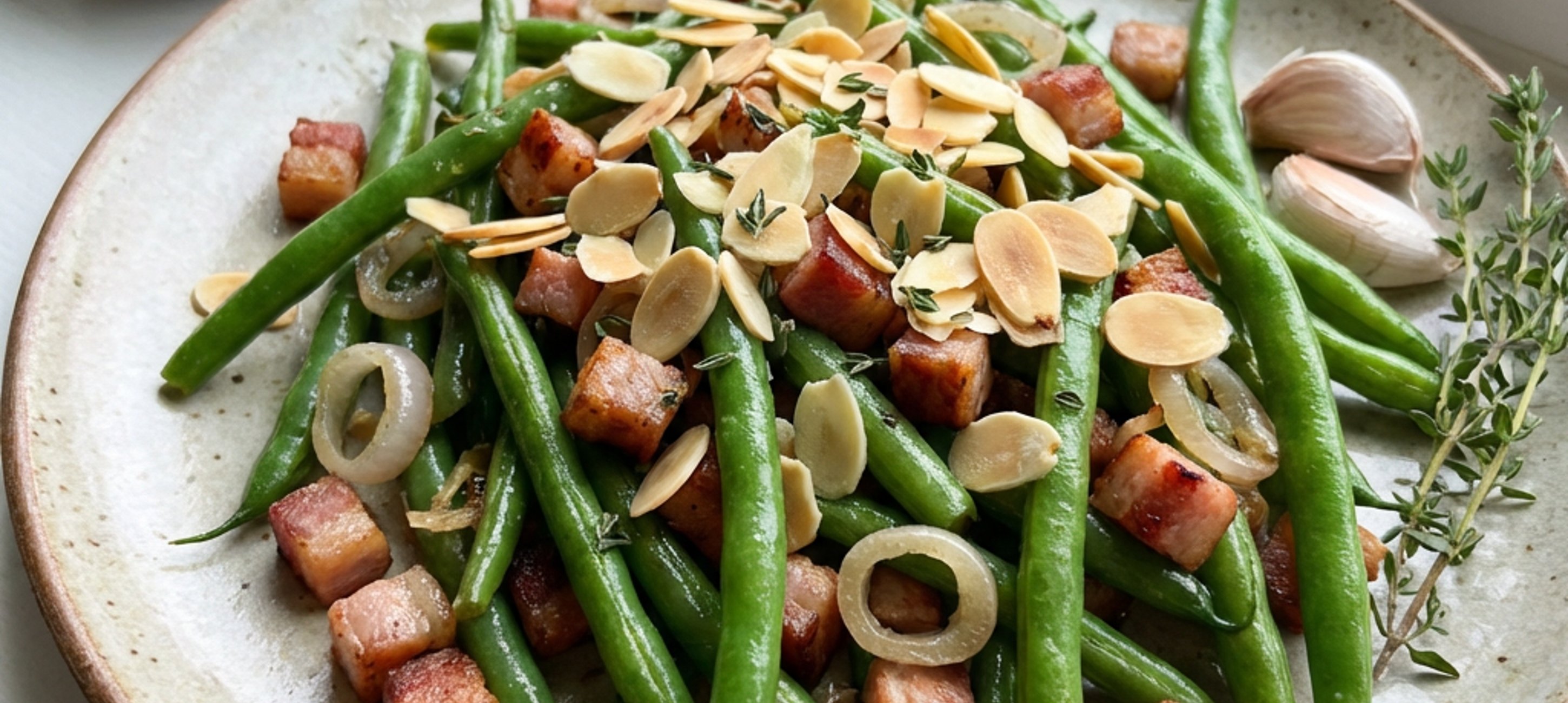 - 2Slaninu nakrájíme na kostičky a zprudka dokřupava orestujeme. Na pánev zpátky vrátíme šalotku s česnekem a přidáme fazolky. Osolíme a opepříme.