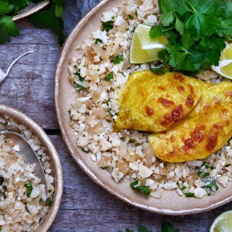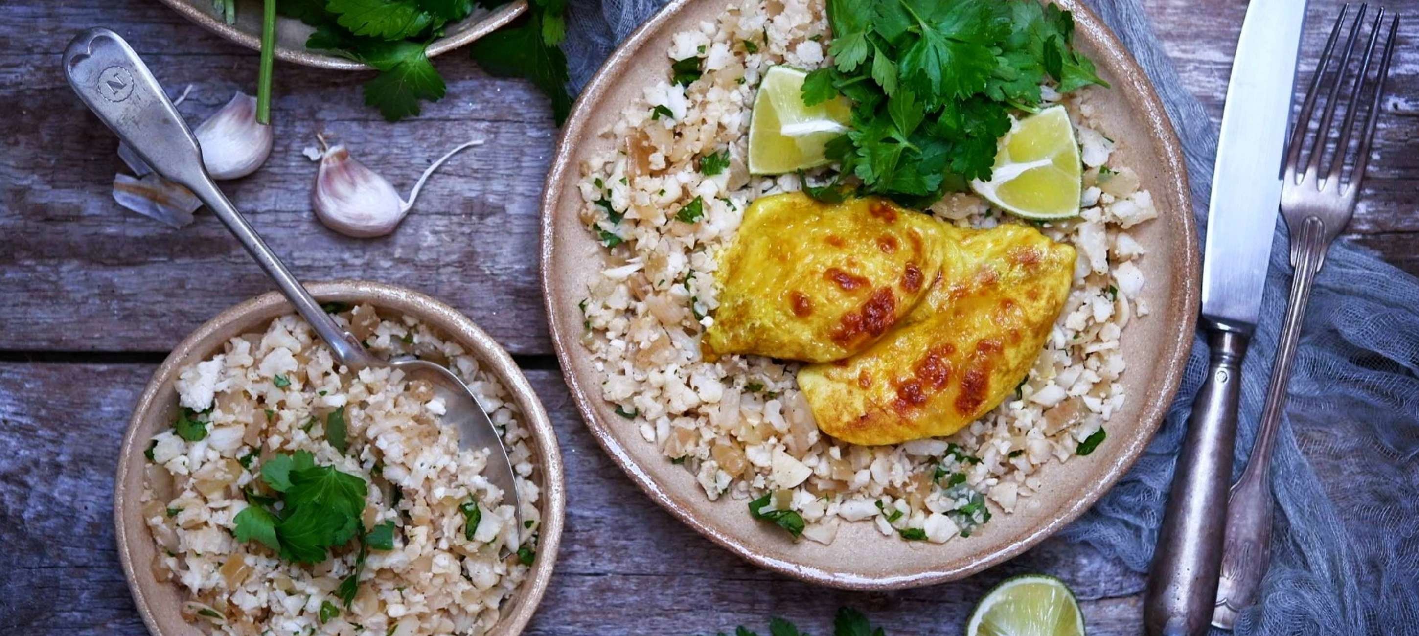 - 3Meanwhile, peel and finely chop the onion, slice the garlic. Break the cauliflower into florets and remove the tough stems. Chop the florets finely, resembling rice. Sauté the onion in 1 tablespoon of olive oil until golden, then add the garlic and let it become fragrant and soft. Add the cauliflower to the pan and sauté for about 5 minutes until soft. Season with salt and pepper. Finally, drizzle with lime juice and add chopped herbs. Serve with the baked chicken and pour over with coconut drippings.