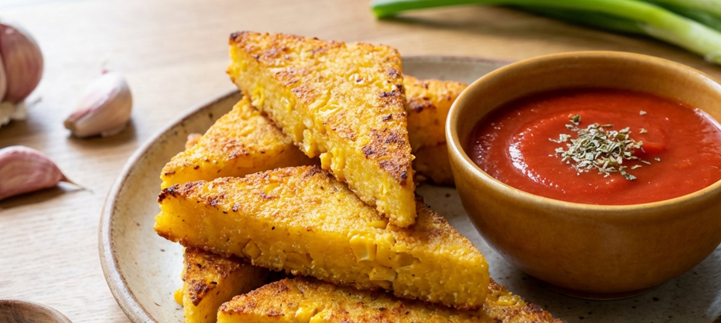 - 5Polentové placky podáváme samotné s rajčatovým dipem, nebo jako přílohu. Skvěle chutnají posypané čerstvou jarní cibulkou.