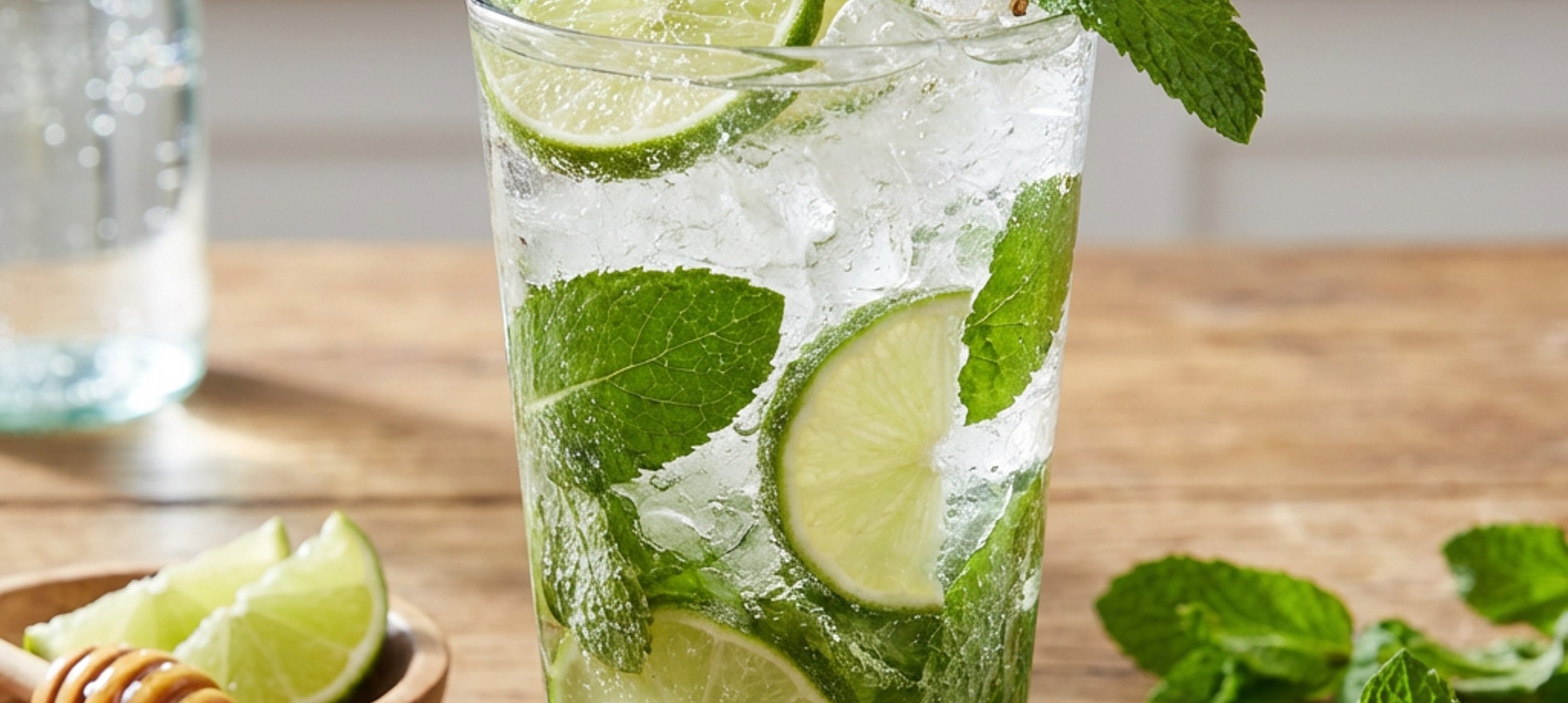 - 1Do vysoké servírovací sklenice přidejte limetkovou šťávu, med, polovinu plátků limetky a lístky máty a rozdrťte.