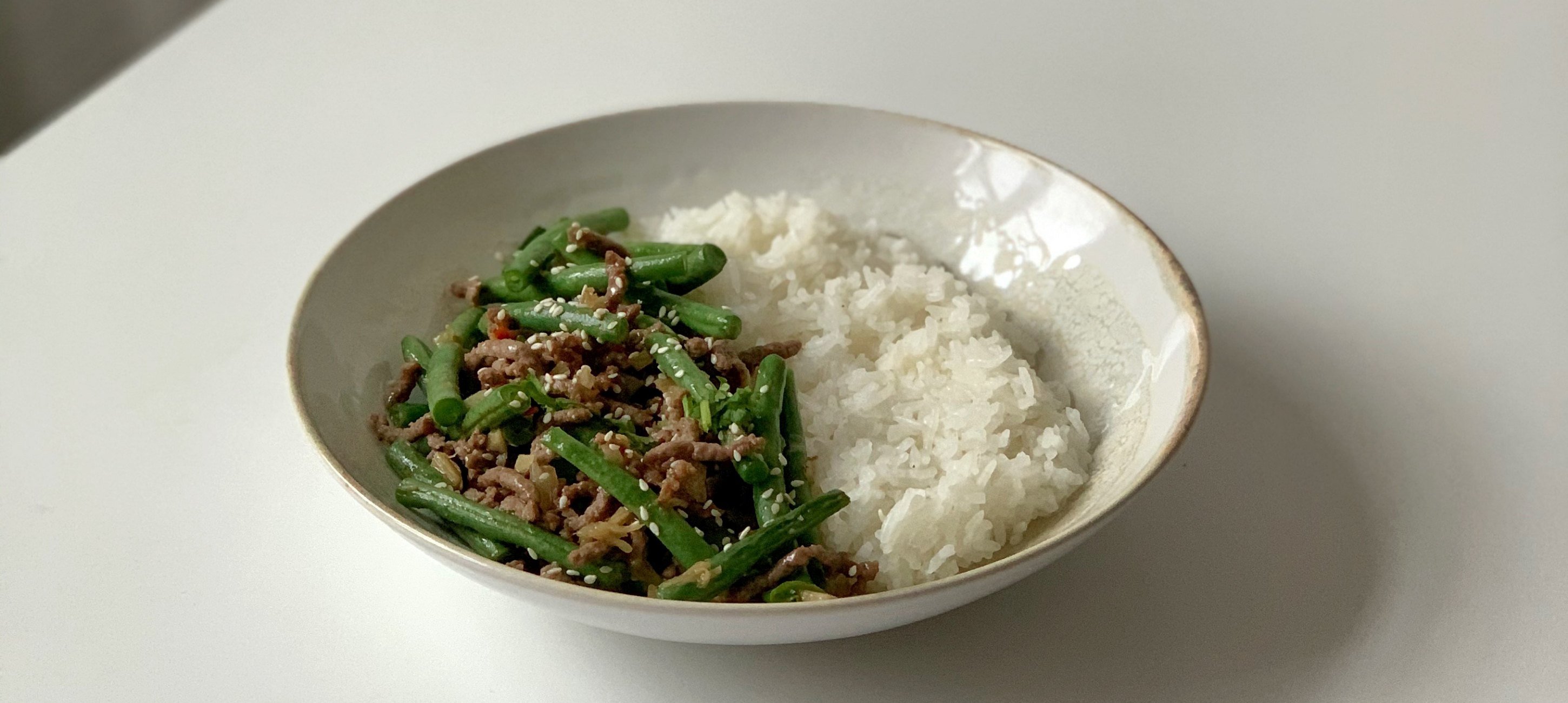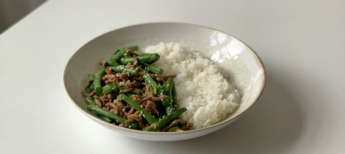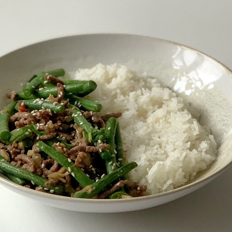 - 2Add the minced meat and sauté for about 2 minutes. Then add the fish sauce, green beans, and sauté together for another 3 minutes.