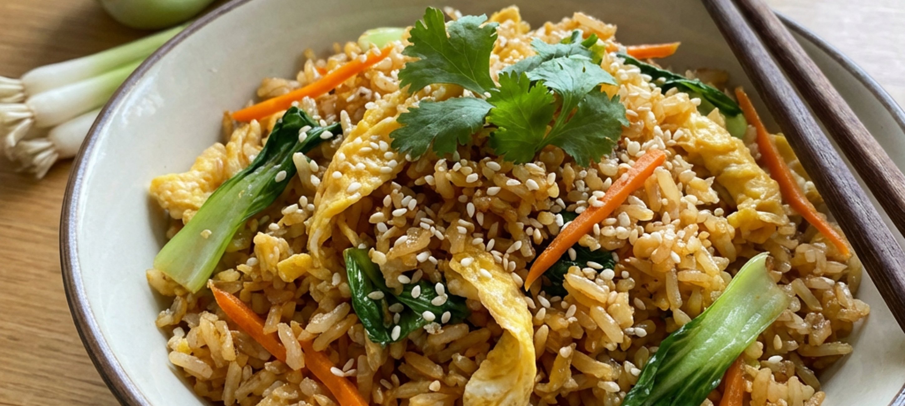 - 3Mrkev, pak choi a jarní cibulku přidejte na konec a restujte další 2 minuty. Dochuťte solí a pepřem. Smaženou rýži dozdobte sezamem a koriandrem.