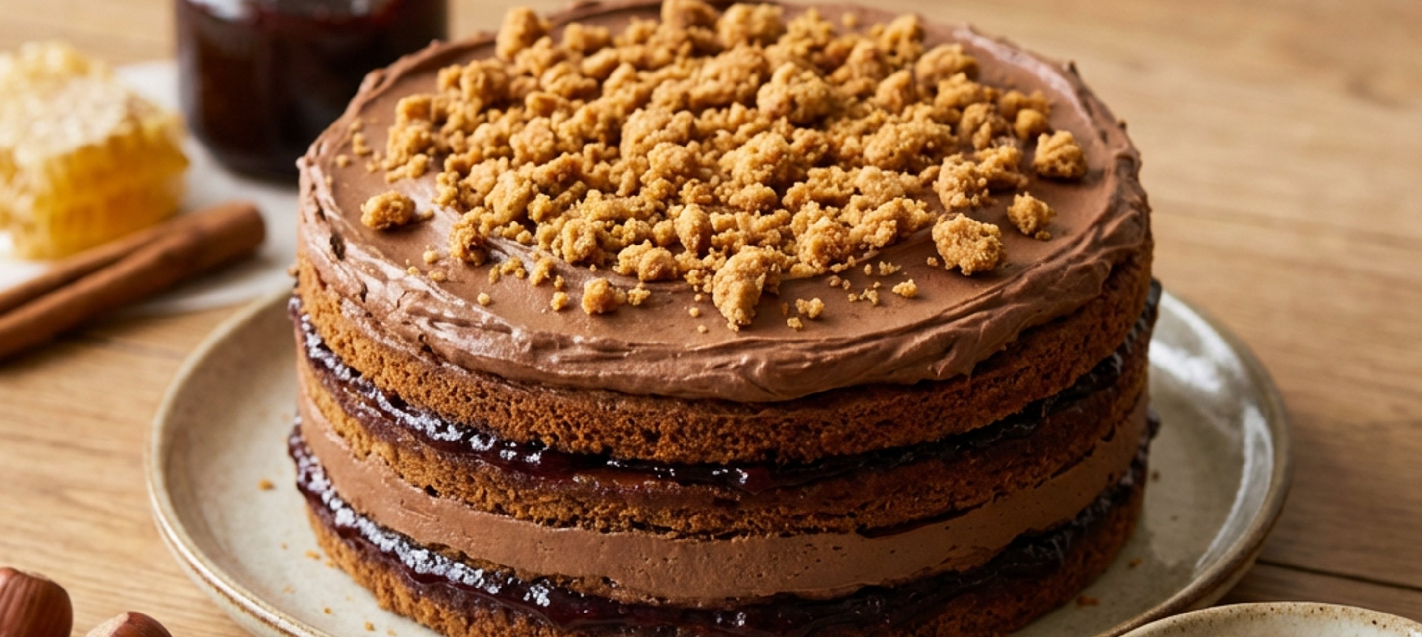 - 2Placky střídavě promažte čokoládovým krémem a povidly, na která poklaďte ořechy, tak, aby vám na předposlední placku vyšla povidlová vrstva. Na poslední placku (nahoru na dort) natřete čokoládový krém. Boky dortu rovněž obmažte čokoládovým krémem.