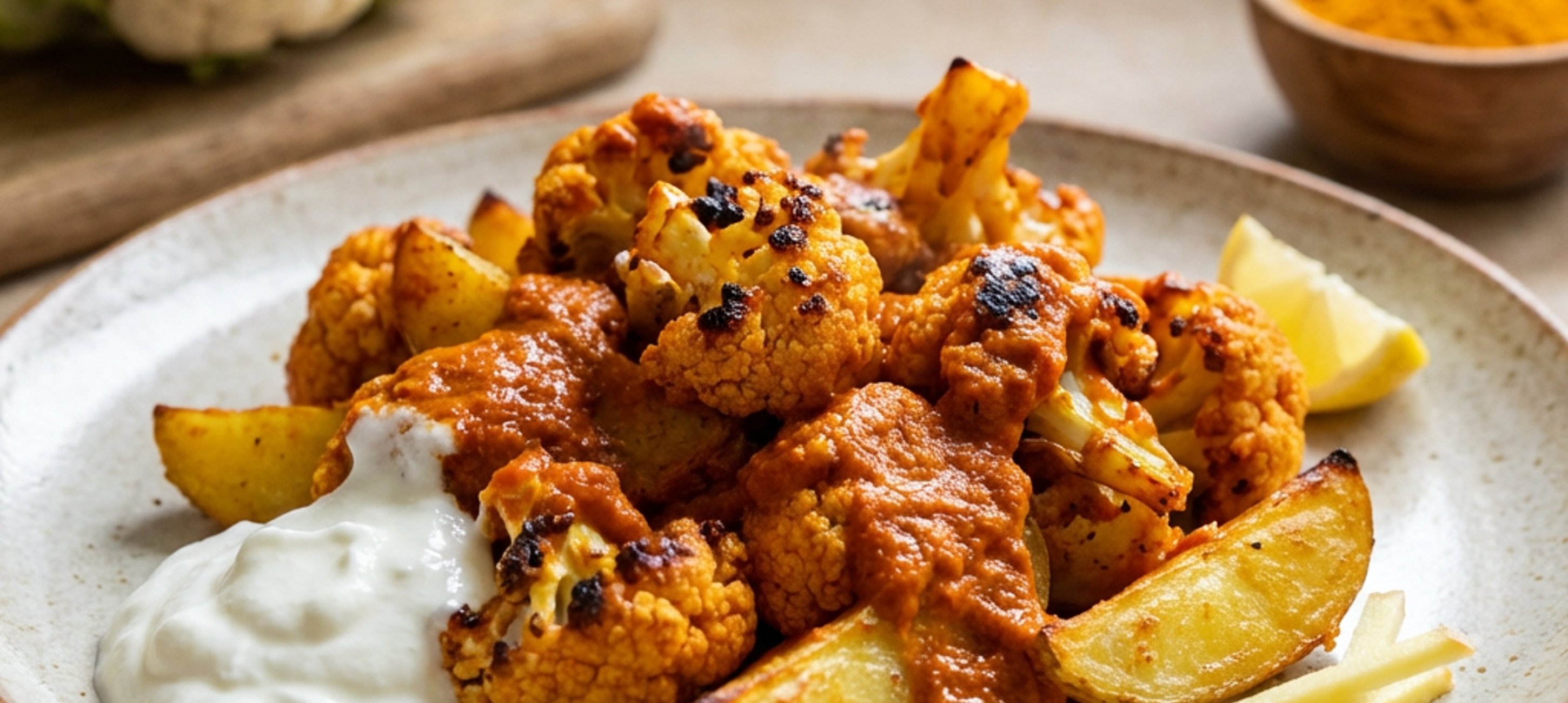 - 6Jakmile jsou květák a brambory uvařené položíme je na rajčatovou omáčku na plech a nahoru na ně naneseme tandoori masalu, kterou jsme si připravili podle bodu 4.