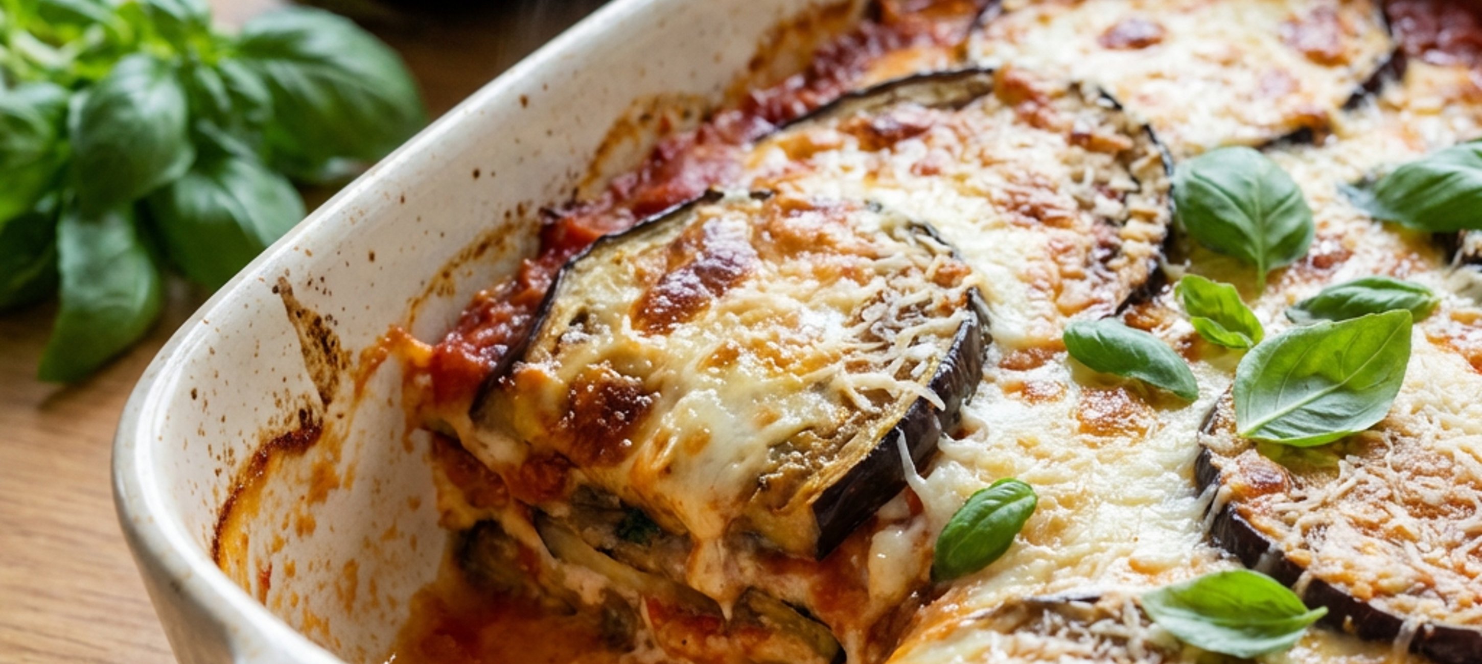 - 4Nyní máme všechny části hotové a můžeme je navrstvit. Zapékací formu o velikosti 20x30 cm vyskládáme 1/3 lilků, poklademe 1/3 rajčatové směsi. Na rajčatovou směs vyskládáme v jedné vrstvě lasagne, které potřeme 1/3 bešamelu. Tento postup ještě 2x zopakujeme. Poslední vrstvu bešamelu posypeme zbylým parmezánem a nahoru poklademe na plátky nakrájenou mozzarellu. Pekáč zakryjeme alobalem a dáme péct na 50 minut do trouby. V polovině pečení alobal sundáme a necháme zapéct sýr do křupava. Po upečení poklademe lístky bazalky.