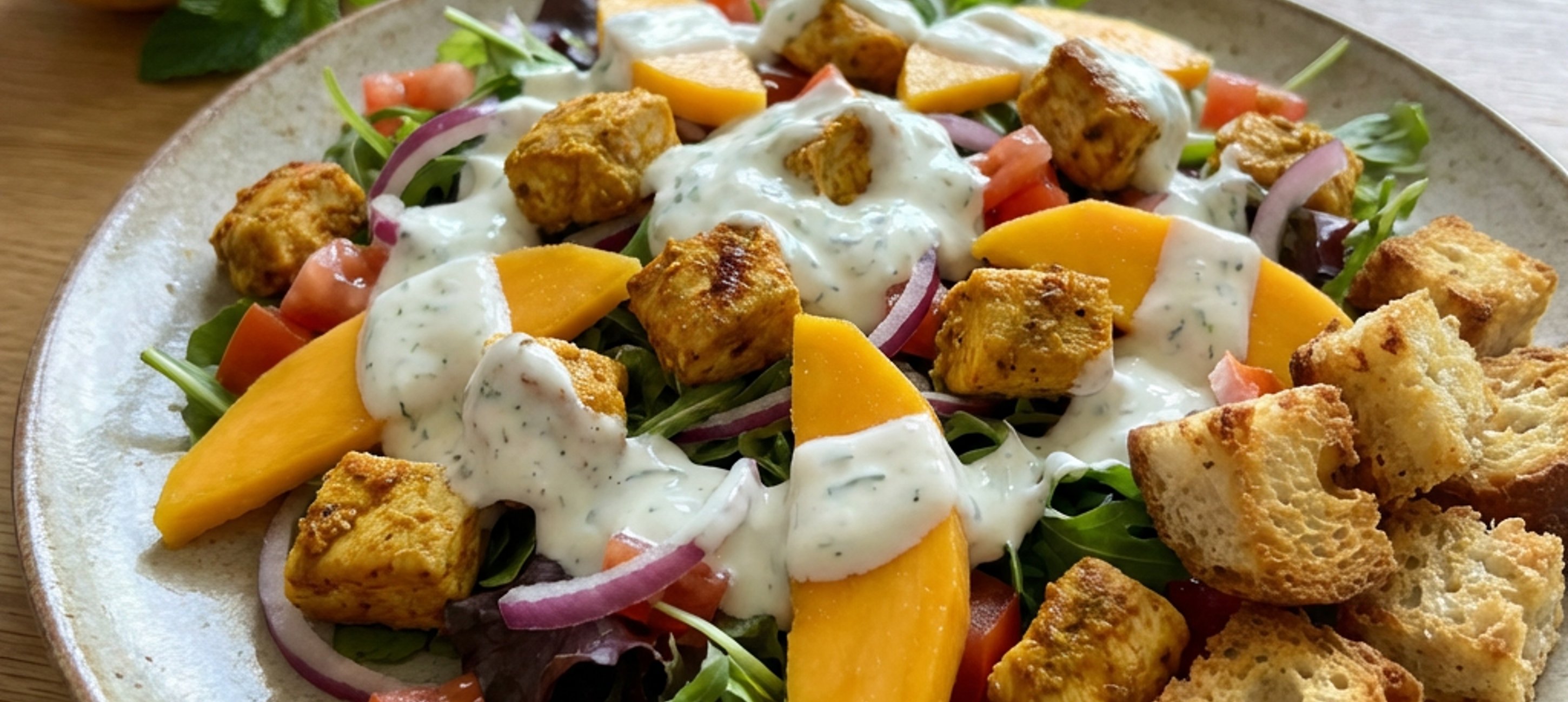 - 3V další misce smícháme mix salátů s cibulí, rajčaty, mangem a dochutíme zbylým olejem a trochou soli.