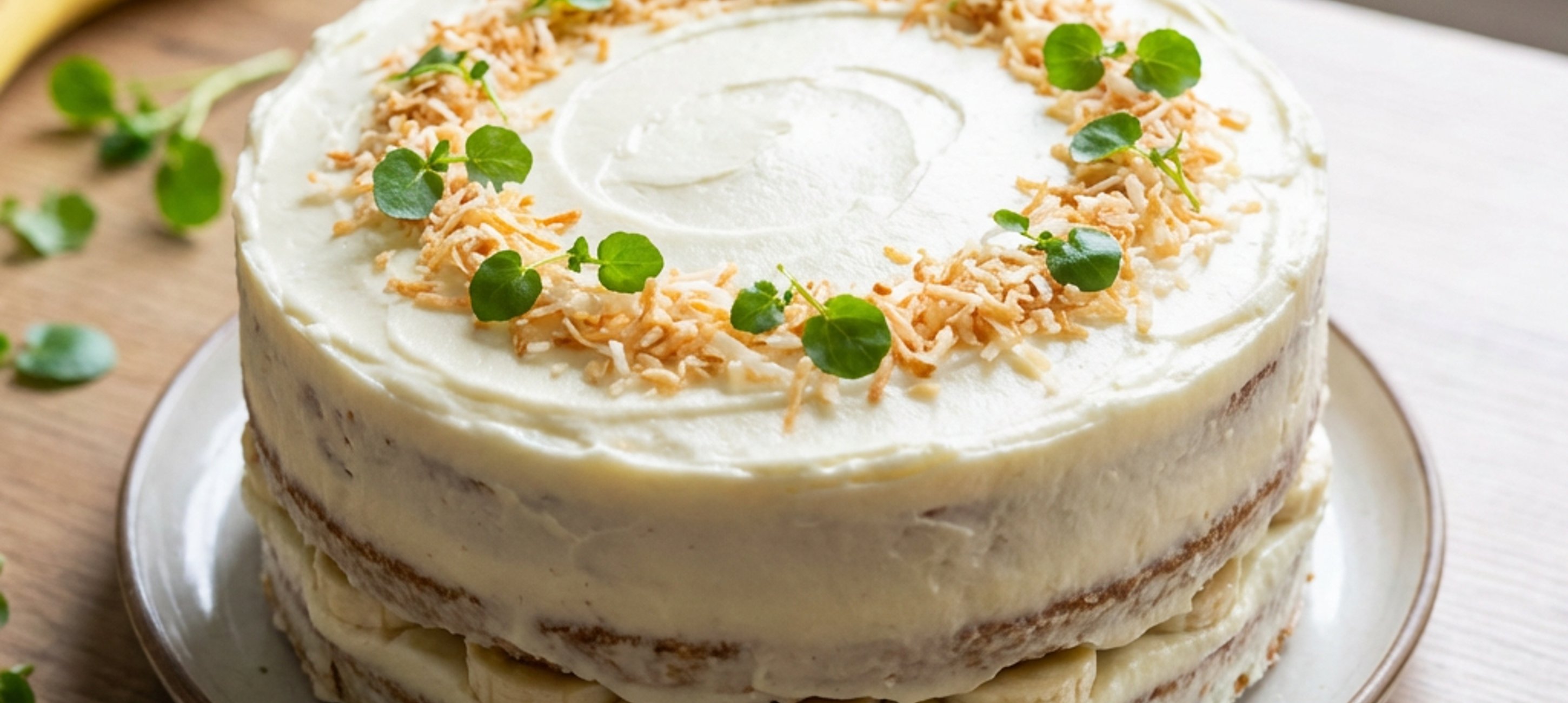 - 2Korpus rozřízněte na 4 díly (pokud máte dva menší, tak každý na polovinu). Na první díl naneste ve slabé vrstvě kokosovo-banánový krém, posypejte trochou opraženého kokosu a naneste vrstvu tvarohového krému. Přiklopte druhým dílem korpusu a postup opakujte. I na třetí část korpusu dejte oba krémy i kokos a na tvarohový krém poklaďte plátky banánu a lehce zatřete tvarohovým krémem.