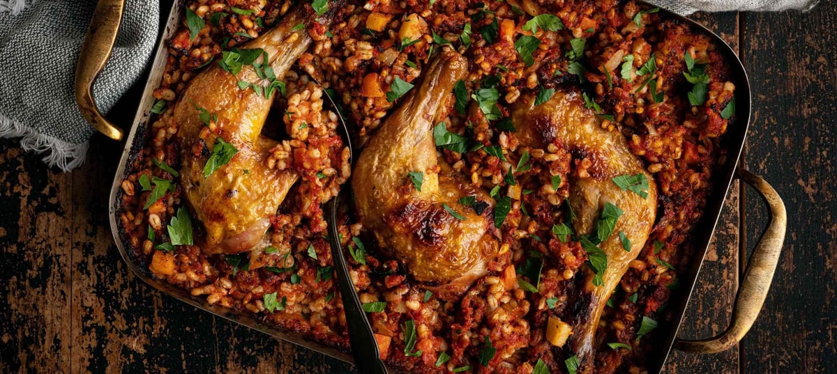 - 2In a large pot that can be placed in the oven, heat oil on the stove. Add the chicken and sear it over high heat until golden brown (2 minutes on each side). Then add celery, carrot, onion, and garlic to the pot and sauté for another 4 minutes over low to medium heat. Next, add barley, broth, and tomatoes, season with salt and pepper, and stir. Cover the pot with a lid (or foil), place it in the oven, and bake for 40–50 minutes at 160–170°C.