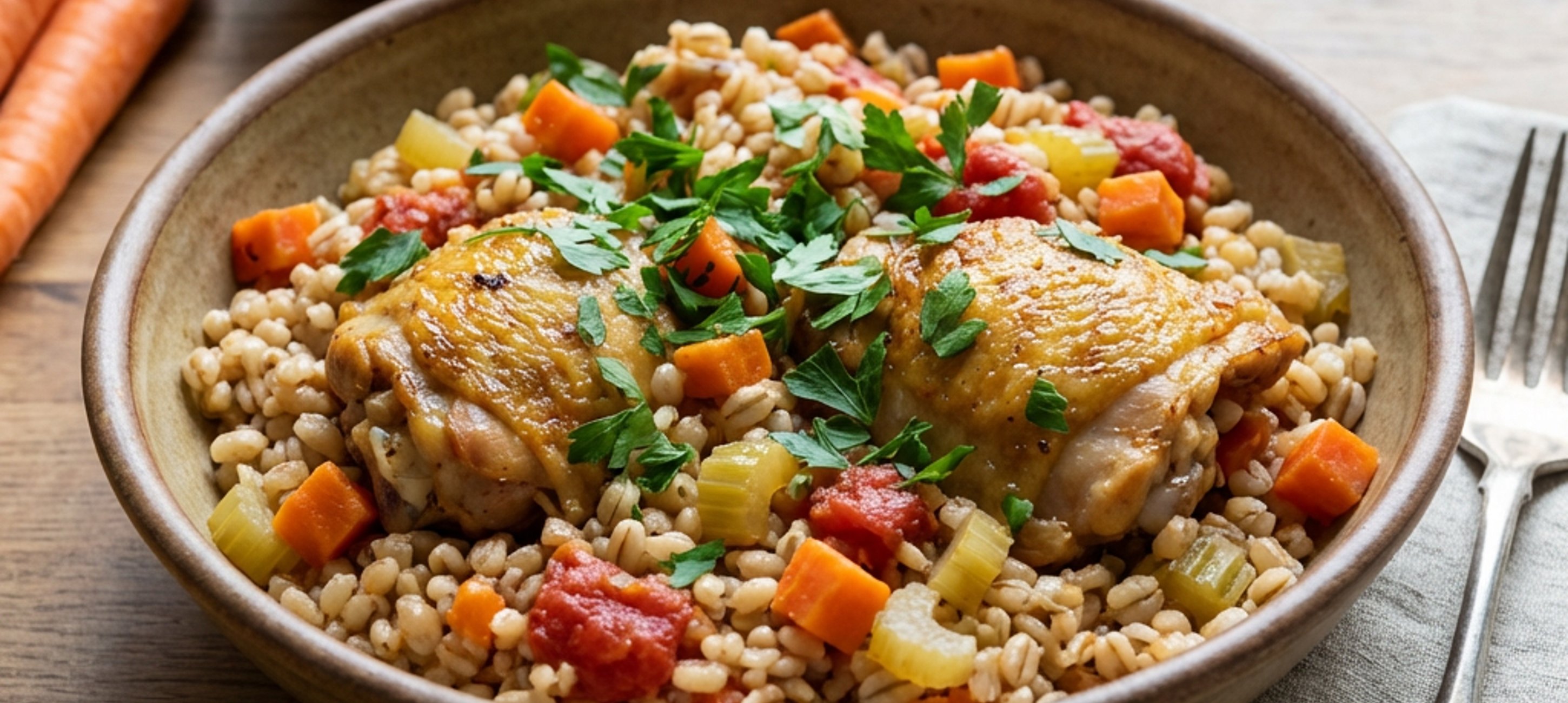 - 2Ve větším hrnci, který je možné vložit do trouby, rozehřejte na sporáku olej. Přidejte kuře a zprudka ho orestujte na silném plameni, dokud nezezlátne (2 minuty z každé strany). Poté do hrnce vložte celer, mrkev, cibuli a česnek a restujte další 4 minuty na mírném až středním plameni. Následně přidejte kroupy, vývar a rajčata, osolte, opepřete a zamíchejte. Hrnec přiklopte pokličkou (nebo zakryjte alobalem), dejte do trouby a pečte 40–50 minut na 160–170 °C.