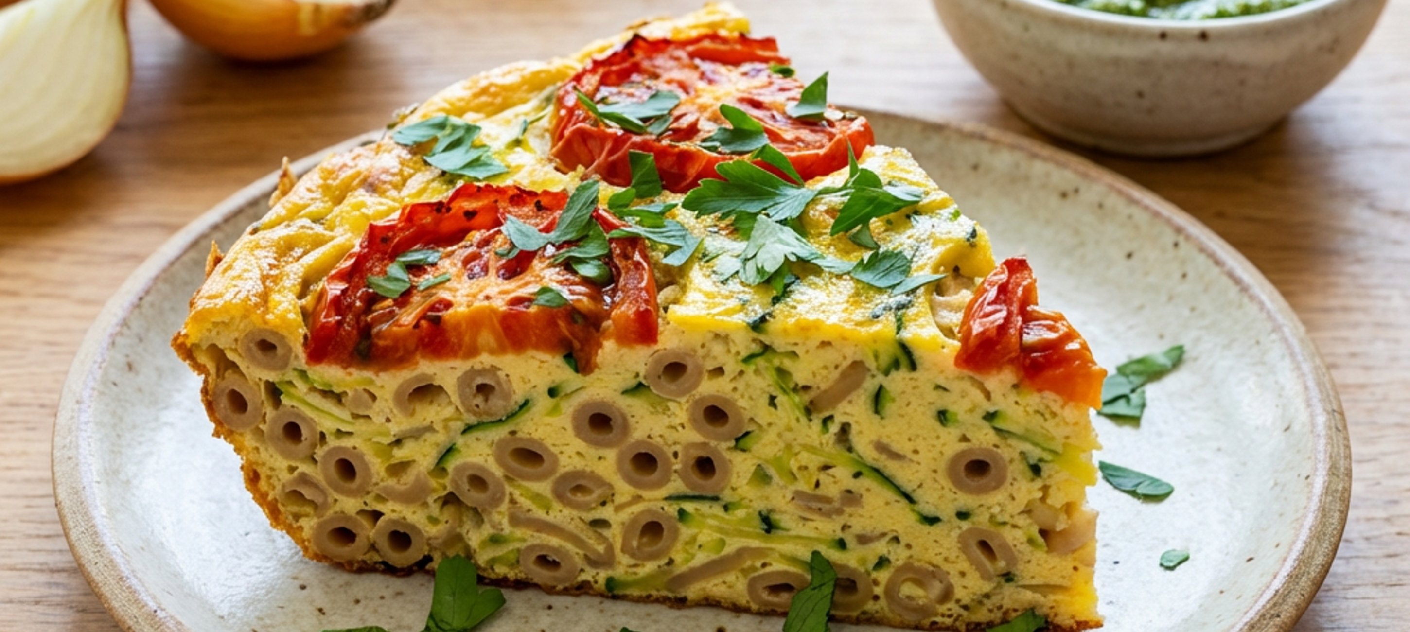 - 4Uvařené těstoviny sceďte, propláchněte pod studenou vodou, zbavte přebytečné vody a přidejte do mísy s vejci a zeleninou. Vše promíchejte a nalijte do připravené pečicí formy. Následně nakrájejte rajčata na silnější plátky, poklaďte je navrch frittaty a pečte 25–30 minut na 170–180 °C.