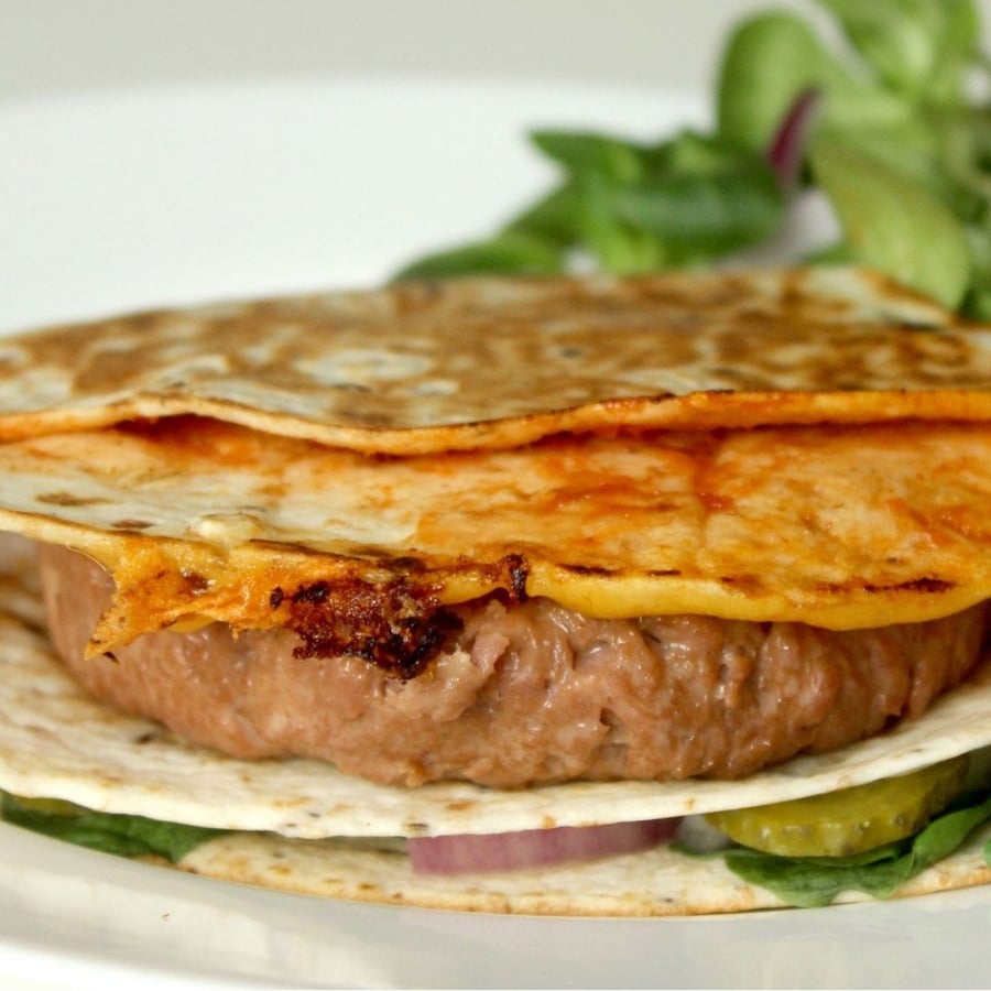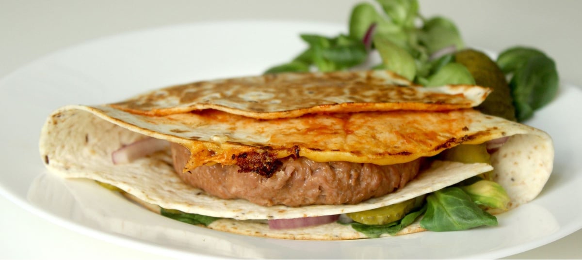 - 5Nyní můžete začít wrap balit. Nejdříve přiložte část s burgerem na cheddar, poté obě části přeložte na salátek a wrap dokončete přeložením na část s kečupem. Pro větší názornost se podívejte na video výše.