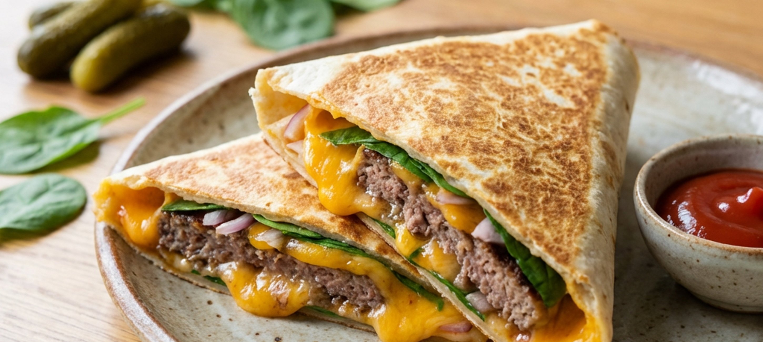 - 4Do první části vlevo od řezu položte maso/vege alternativu. Do další části plátek cheddaru. Na další část tortilly přijde směs nakrájené šalotky, kyselých okurek a pár lístků baby špenátu. Poslední část pomažte kečupem.
