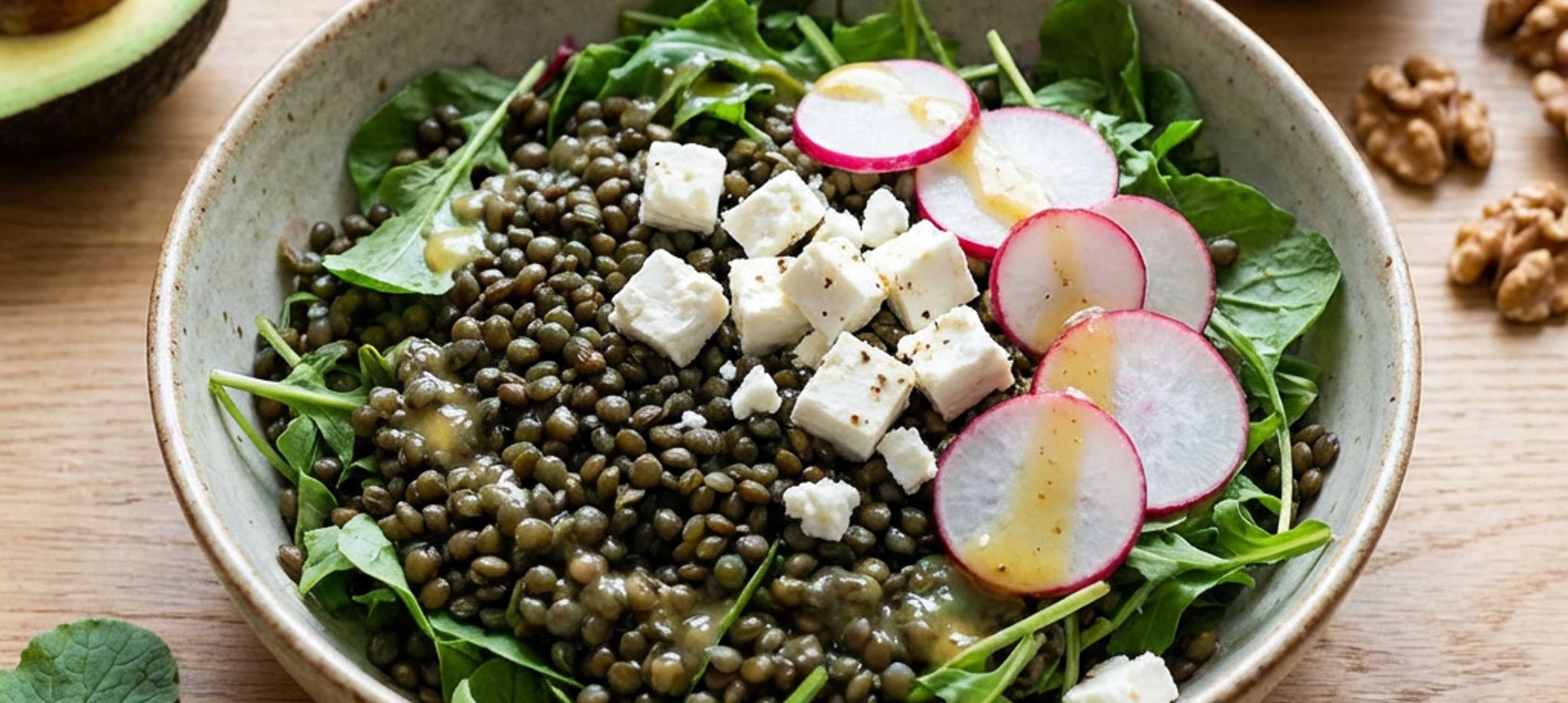 - 3Salát vložíme do mísy, přidáme na kostky nakrájené avokádo, na plátky nakrájené ředkvičky a vařenou čočku. Fetu nakrájíme na kostky nebo rozdrobíme a přidáme k salátu.