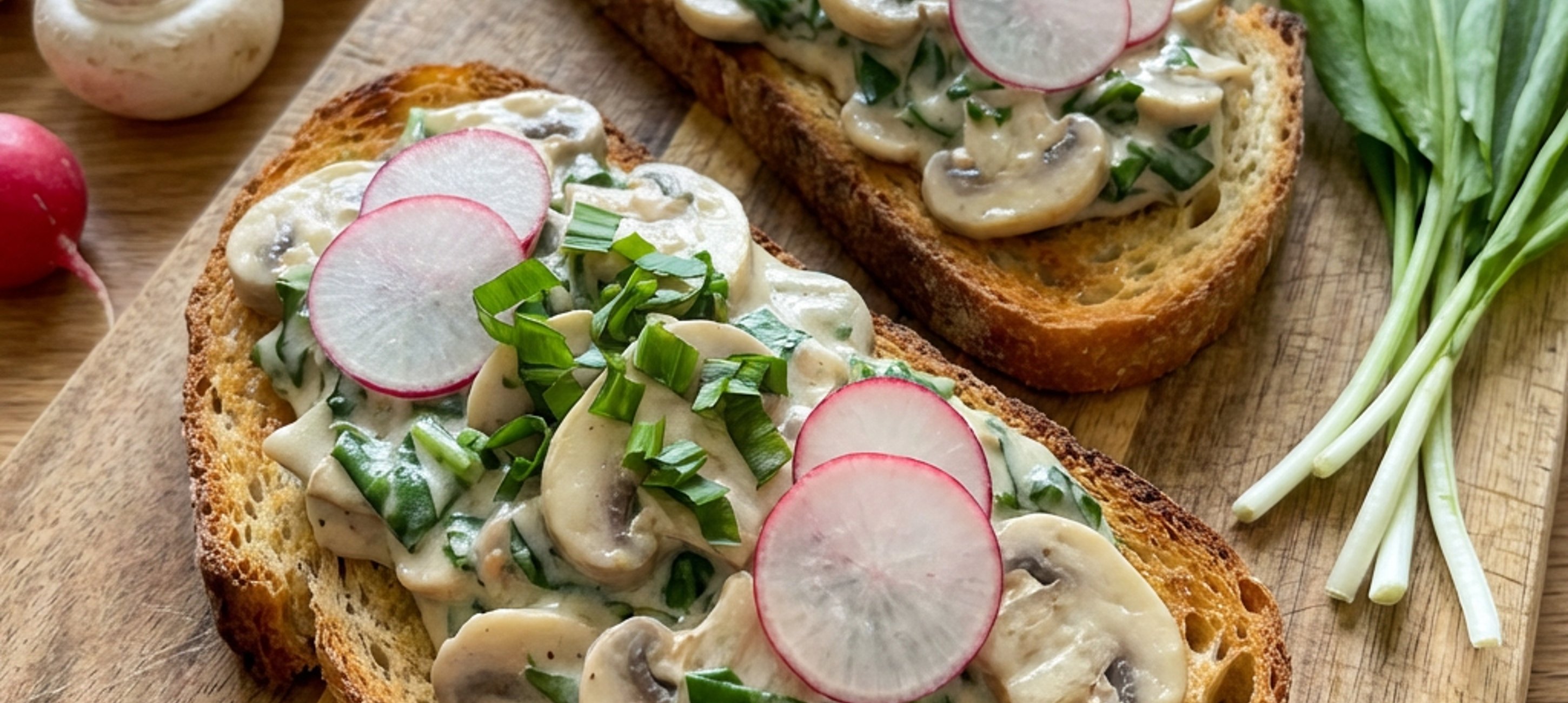 - 8Na opečeném chlebu servírujte žampionovou směs. Ozdobte nasekaným medvědím česnekem a plátky ředkviček.