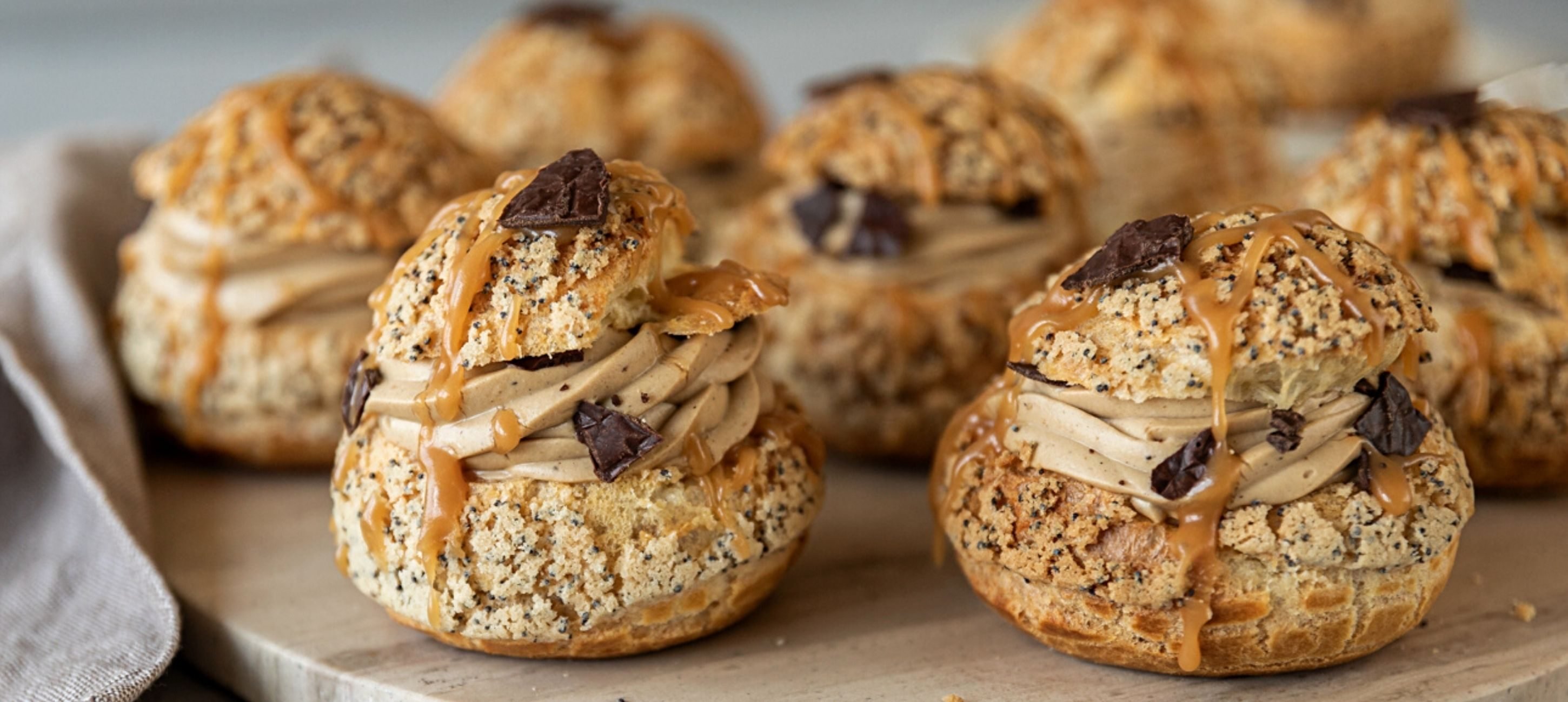 - 7Remove the poppy seed dough and cut out 4 cm circles, which you place on top of the choux pastries (you can put the dough back in the freezer as needed, it makes it easier to work with).