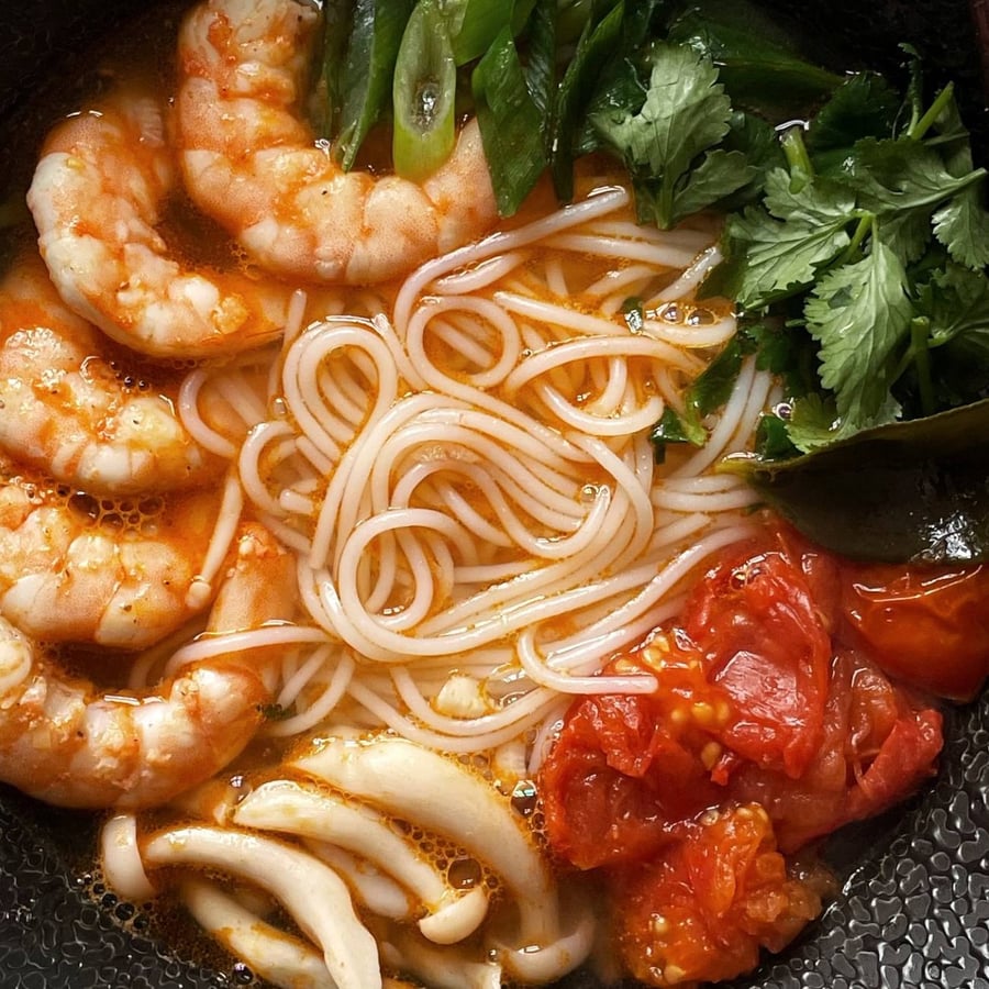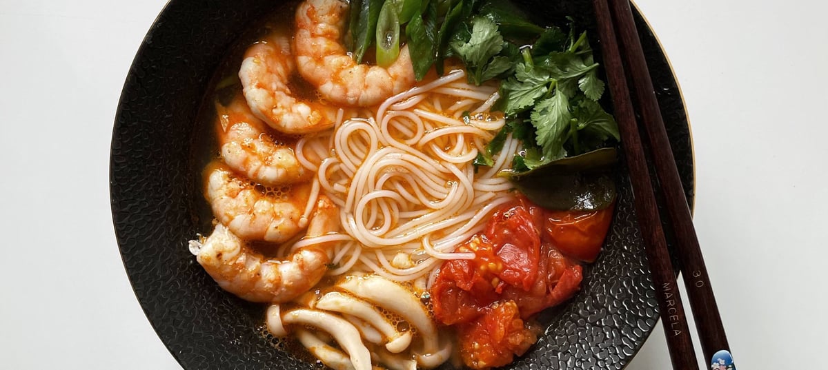 - 4Add noodles, shrimp, tomatoes, spring onion, coriander, and chili to a bowl. Pour over with hot broth.