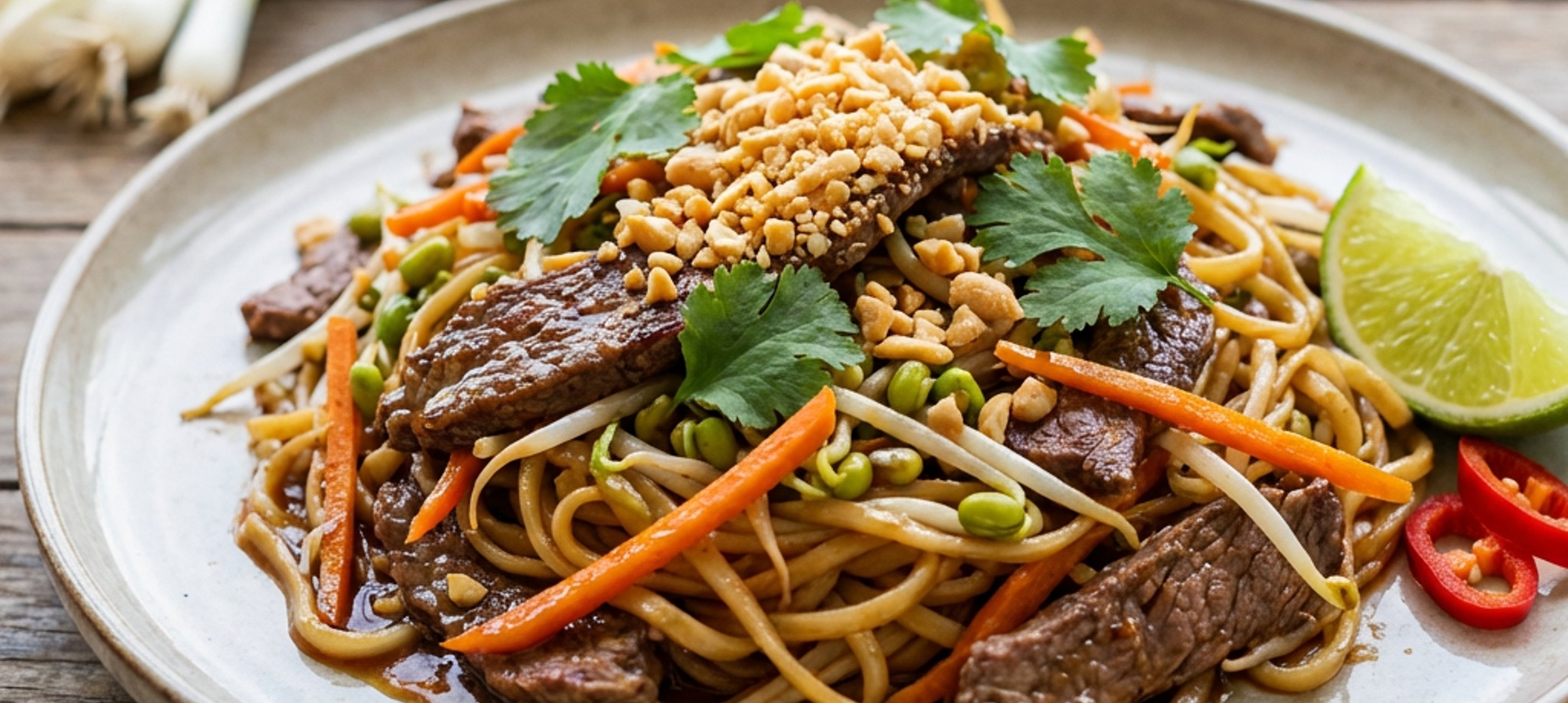- 3Na závěr nudle posypte koriandrem, arašídy a zakápněte limetou.