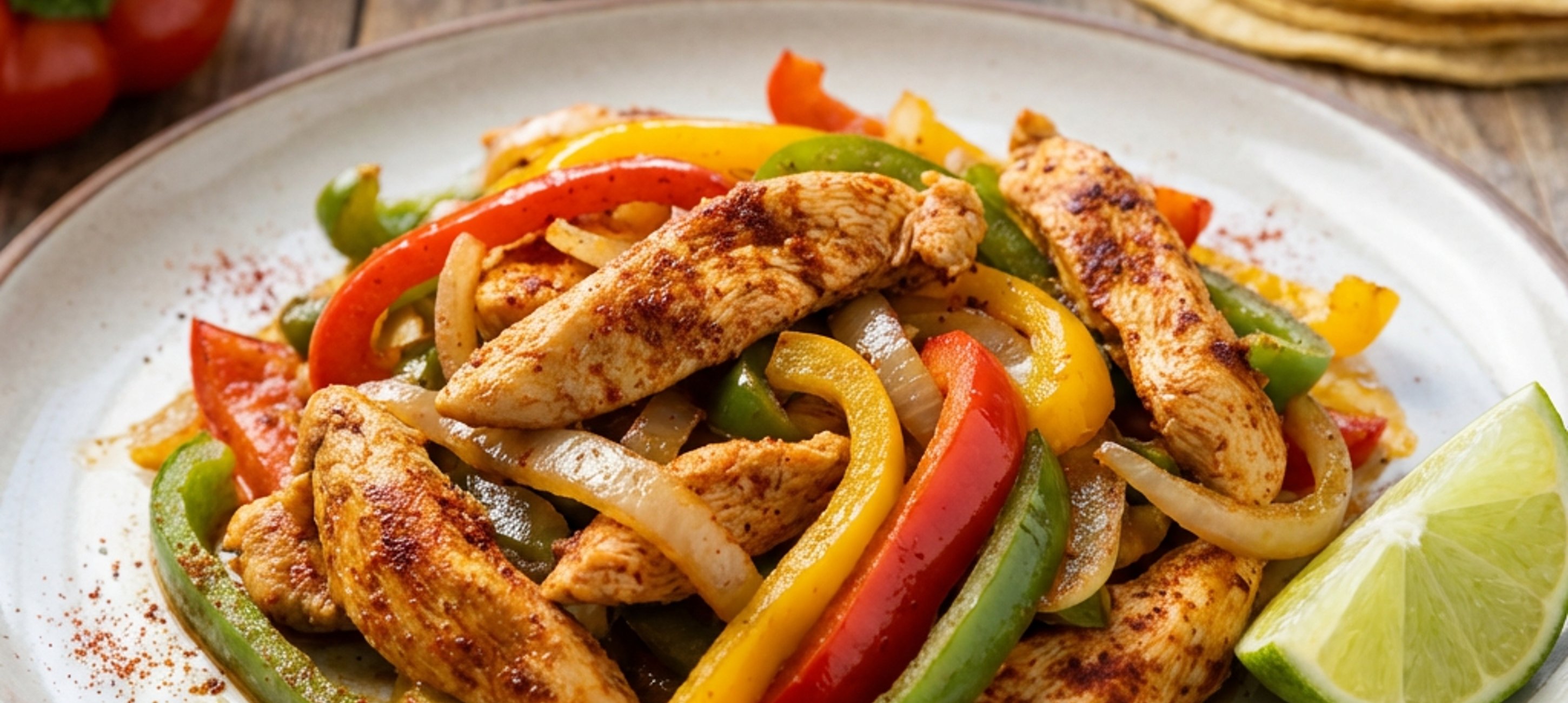 - 2V misce smíchejte 1 lžíci olivového oleje, šťávu z ½ limetky, chilli koření, uzenou papriku, pepř, kmín a sůl. Kuřecí maso nakrájejte na nudličky a promíchejte se směsí koření.