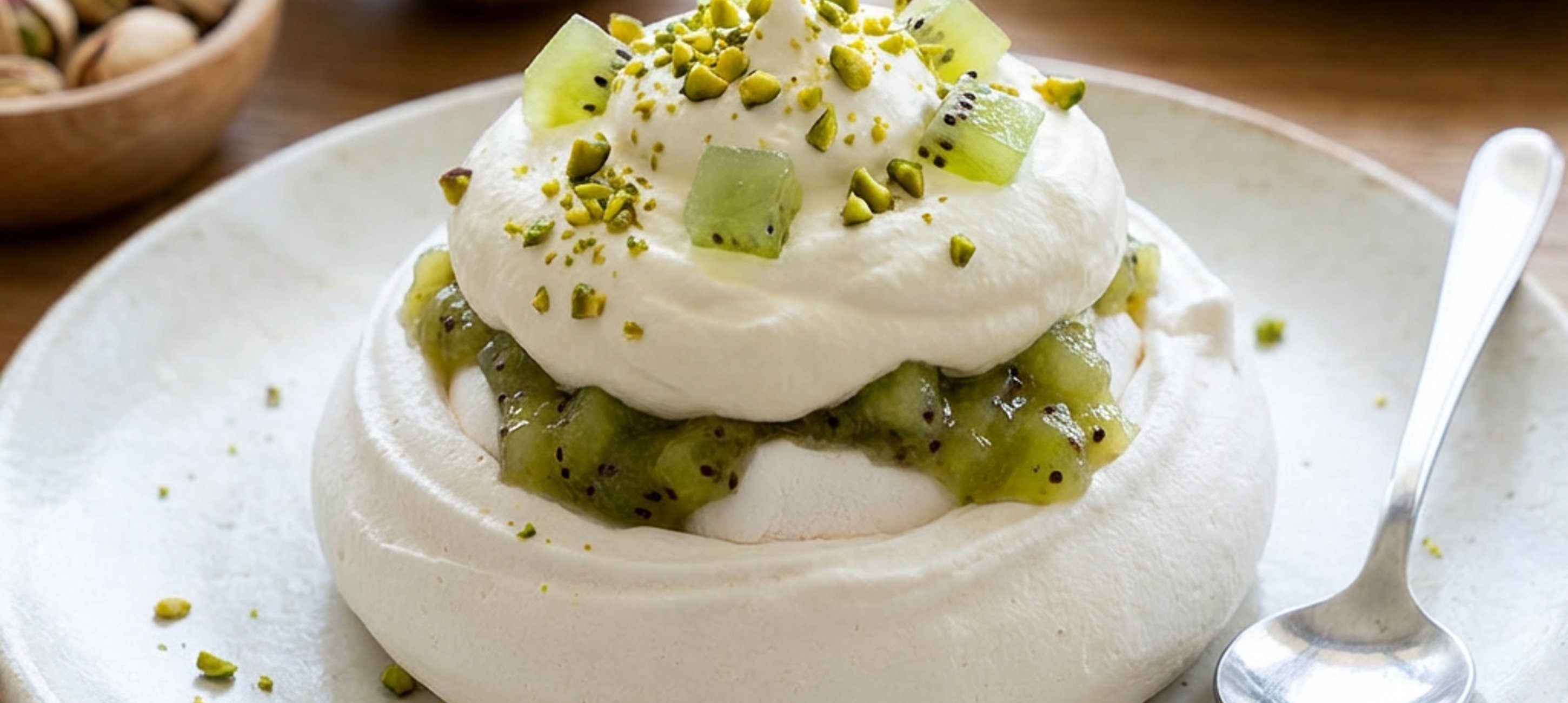 - 1Ušlehejte dotuha šlehačku. Na dno korpusů naneste kiwi kompot. Lžící na kompot nandejte šlehačku a dozdobte vykrájeným želé, čerstvým kiwi a posekanými pistáciemi.