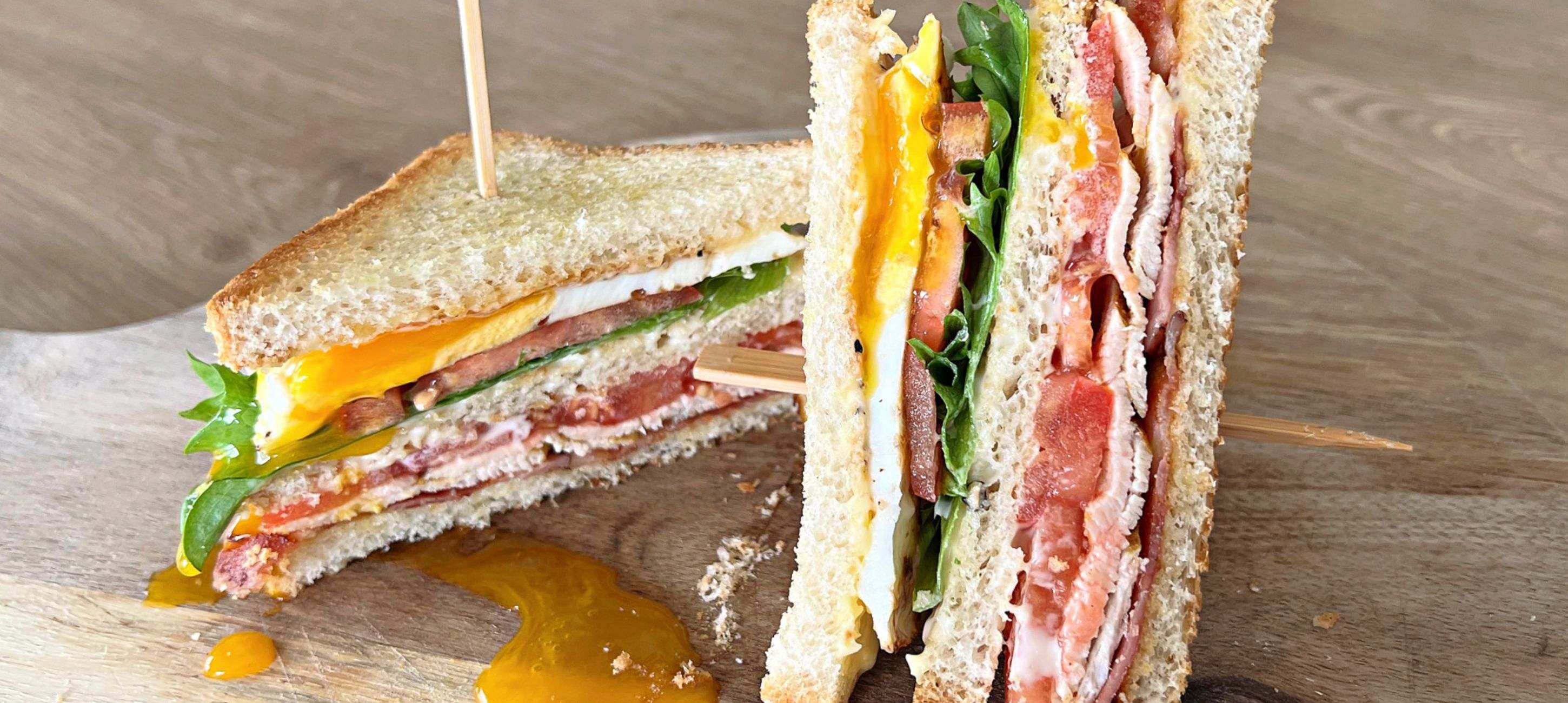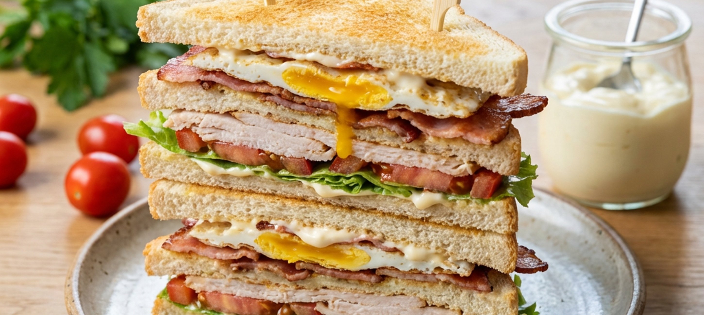 - 3Kompletujte sandwich v následujícím pořadí: toast, majonéza, slanina, krůtí maso, rajčata, majonéza, toast, majonéza, salát, rajčata, vejce, majonéza, toast.