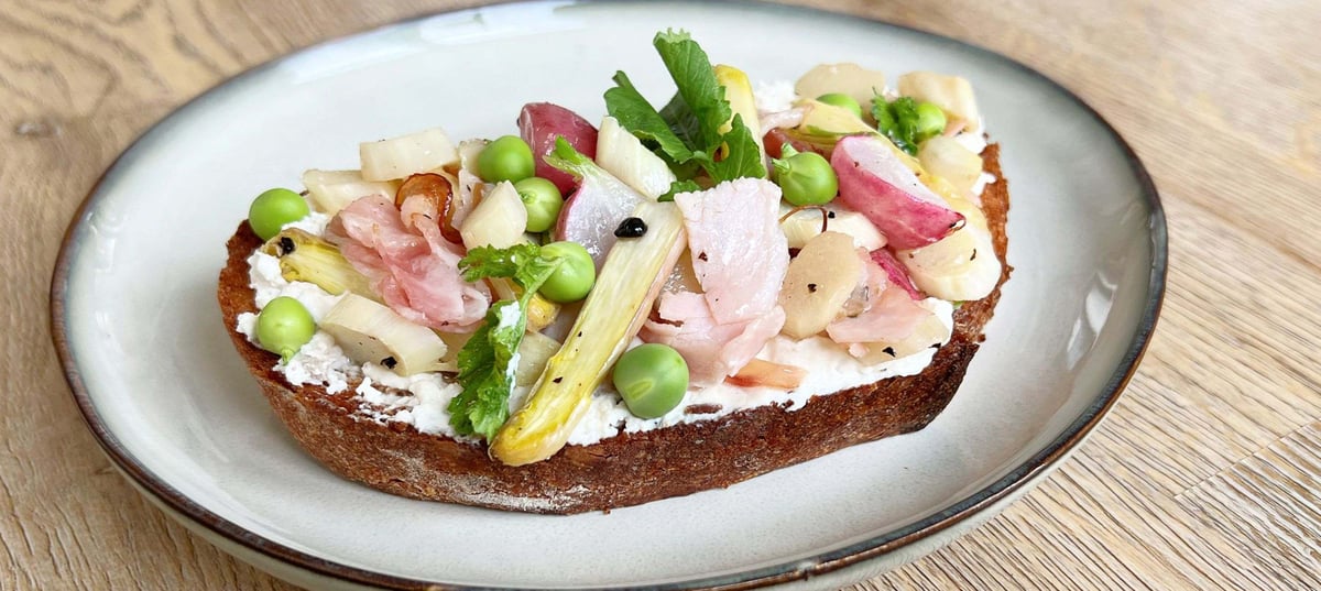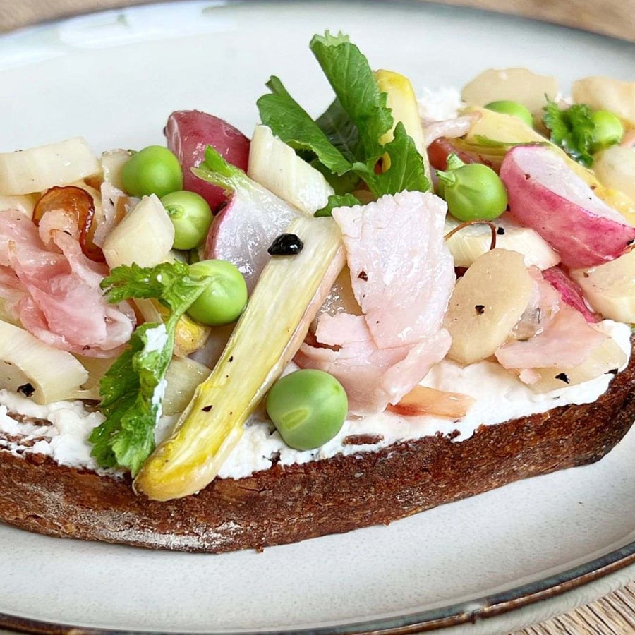 - 4Generously spread the toast with fresh cheese, top with the baked asparagus mixture. You can garnish with tiny radish leaves and freshly shelled peas. Serve hot.