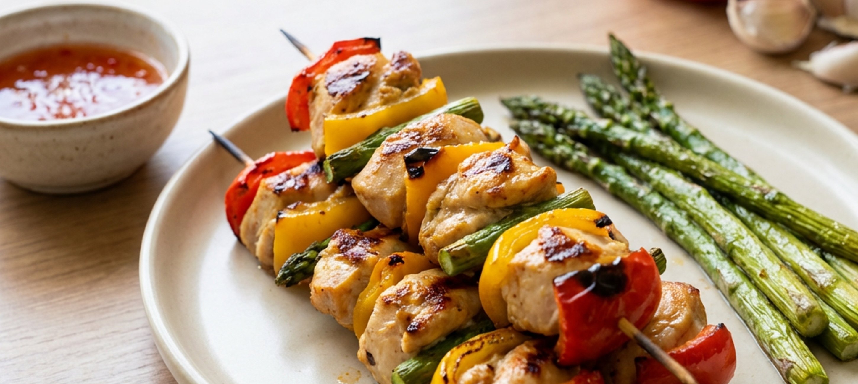 - 5Na špízovou jehlu napichujeme střídavě maso, papriku a chřest. Špízy naskládáme na plech a podlijeme vodou (cca 2 dcl). Troubu vyhřejeme na 200°C, vložíme plech se špízy a pečeme 20 minut.