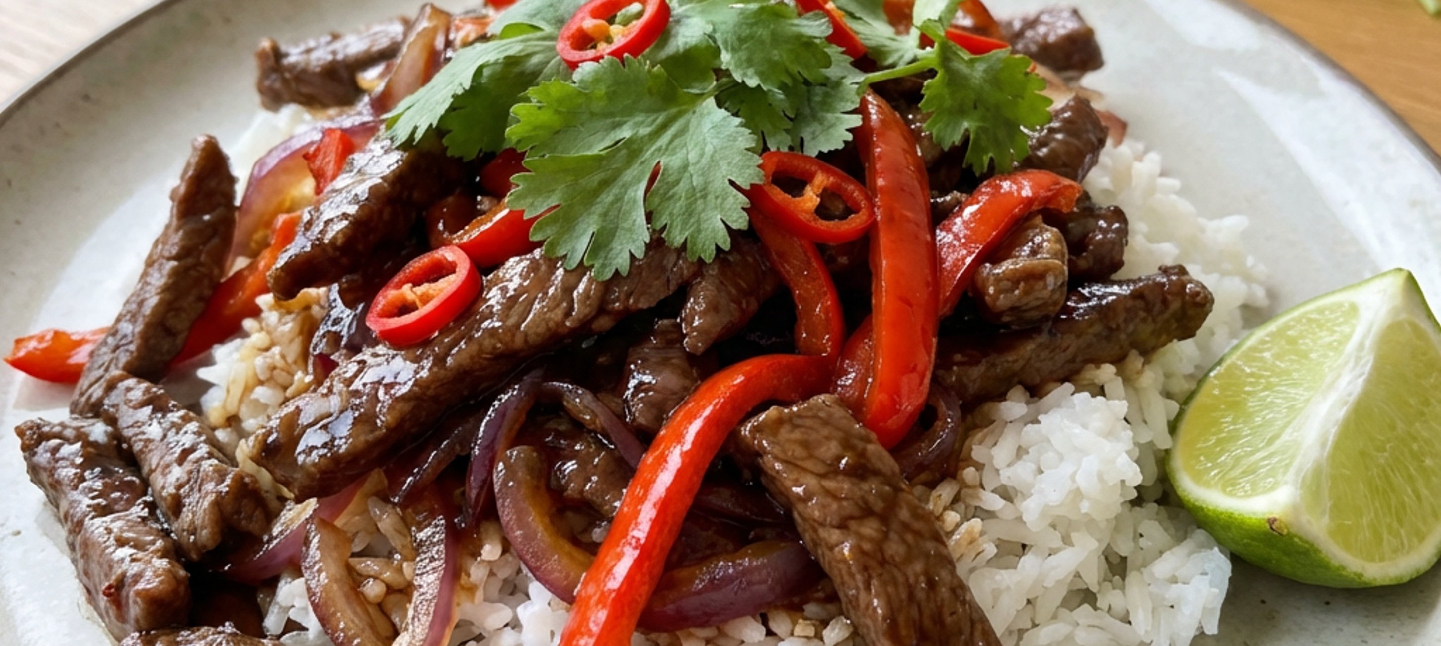 - 3V rozpálené pánvi s olejem osmažíme maso z obou stran. Bude hotové za pár minut a dáme stranou. Do pánve nalijeme kapku oleje a orestujeme cibuli, papriku, česnek a chilli papričku. Jakmile je zelenina na skus přidáme maso a omáčku a necháme prohřát, dokud nezhoustne. Ochutnáme a pokud je třeba dochutíme solí.