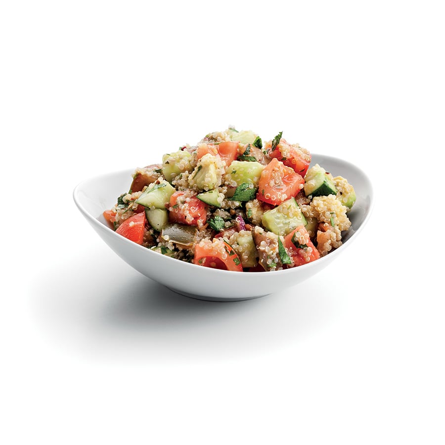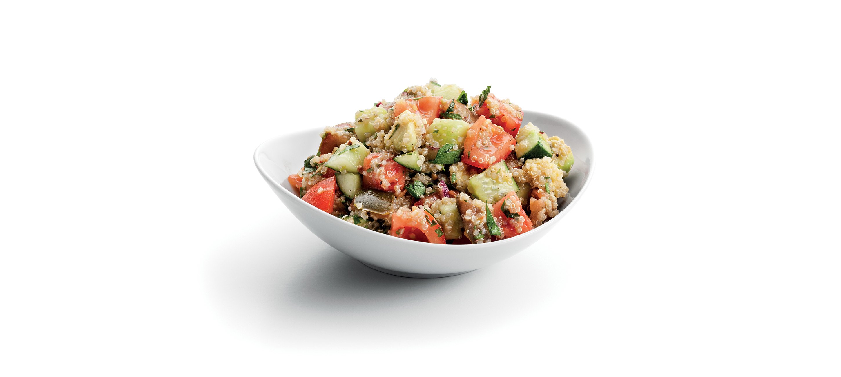- 3V míse smícháme rajčata, okurky a červenou cibuli. Přidáme olivový olej, citronovou šťávu a vinný ocet a promícháme. Přidáme avokádo, česnek, bylinky a vychladlou quinou. Promícháme a dle chuti osolíme a opepříme.