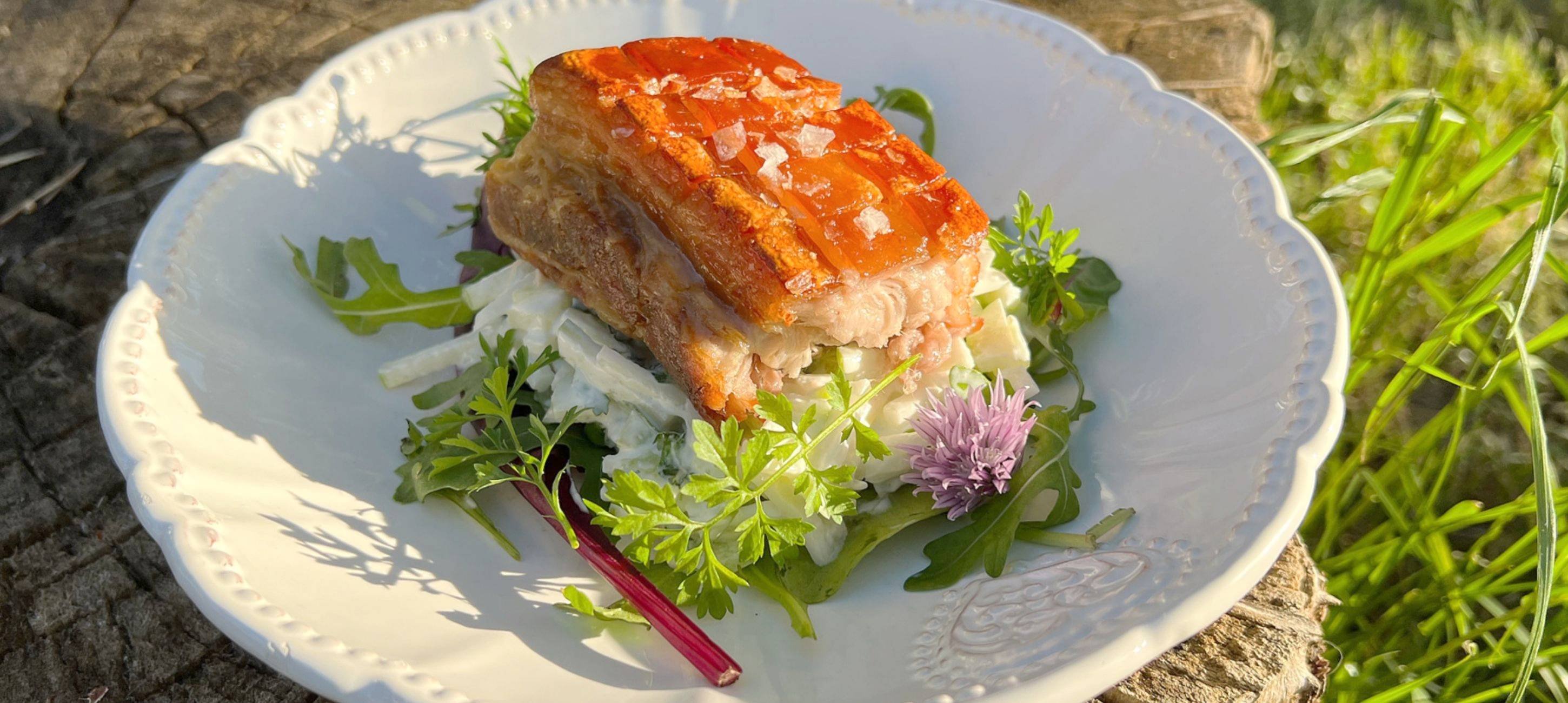 In the meantime, prepare the salad. Peel the kohlrabi and the convex side of the celery stalks, leave the apple skin on. Cut into tiny pieces or thin short strips. Drizzle thoroughly with lemon juice, add enough yogurt to bind the mixture to a coleslaw-like consistency. Season with salt, freshly ground pepper, and finely chopped fresh herbs. Mix and place in the fridge to chill until the pork belly is done.